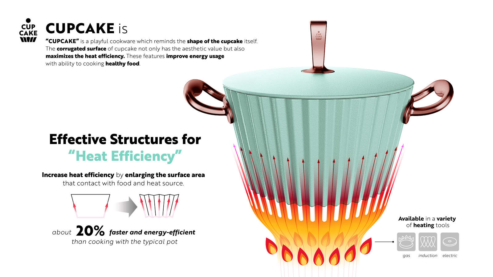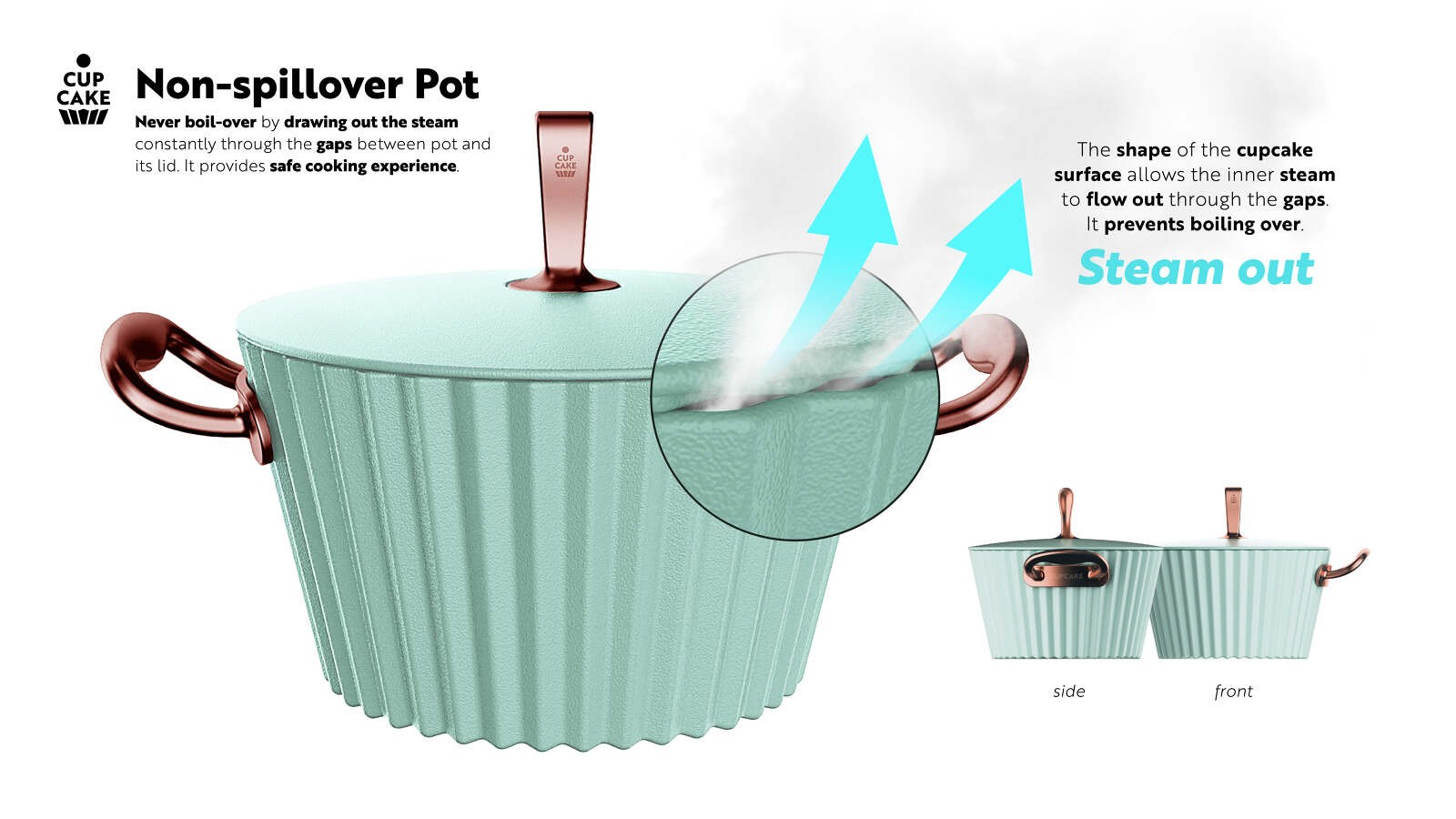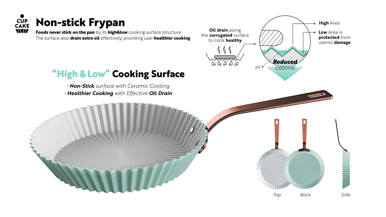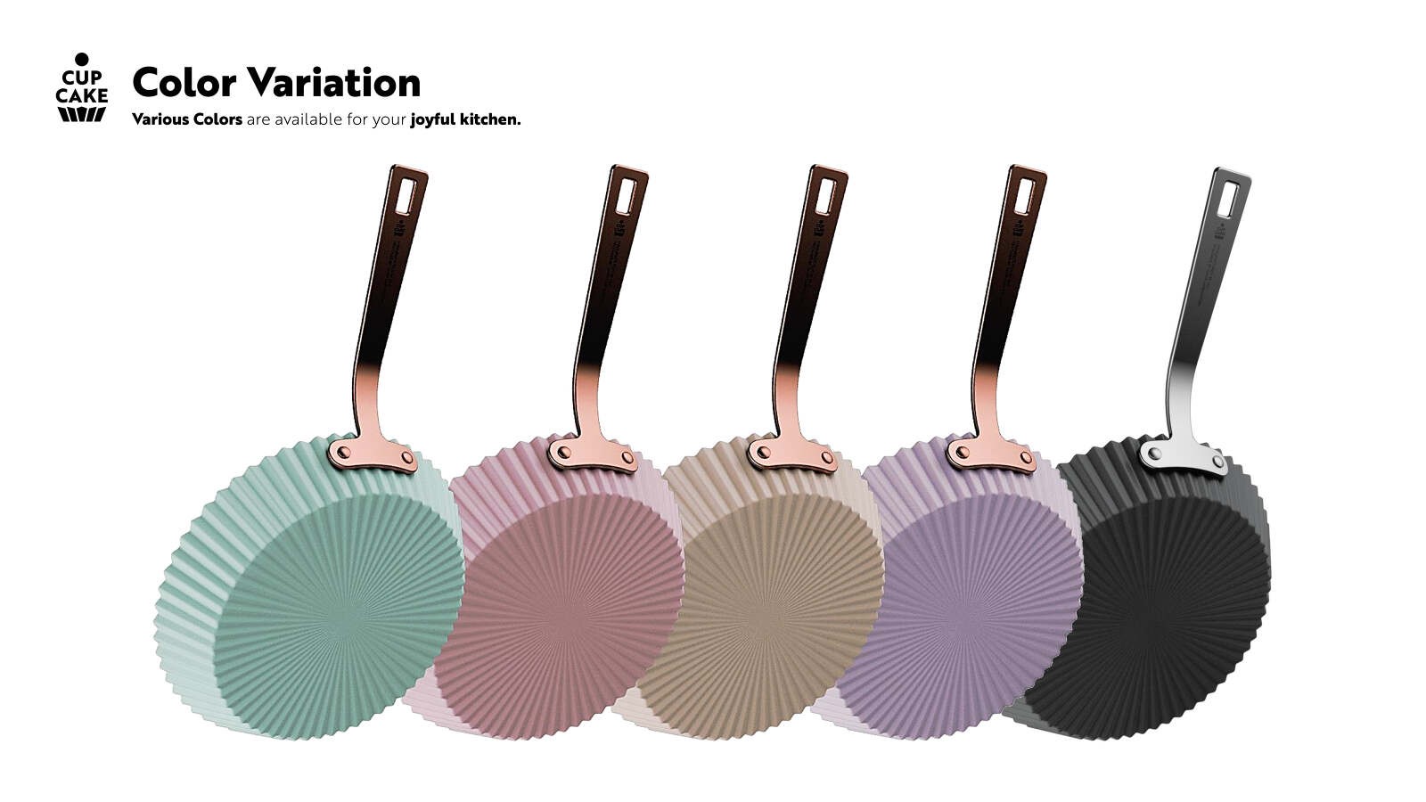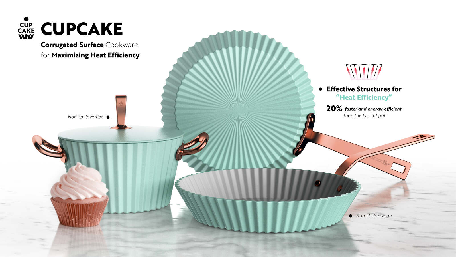 CUPCAKE is playful cookware which takes its shape motif from a cupcake. The bumpy surface structure of a CUPCAKE not only show an aesthetic value but also maximizes the heating efficiency. Also the non-stick surface and effective oil drain due to its unique inner surface, users can cook healthier than before. Because CUPCAKE has a unique shape and playful colors, one would question its practicality of design in its use in cooking. But on the contrary, this aesthetic product shows high performance in heating efficiency, which results in better cooking. Such a feature clearly shows the exceptional quality of the CUPCAKE being a product of great harmony between aesthetic form and functional practicality.