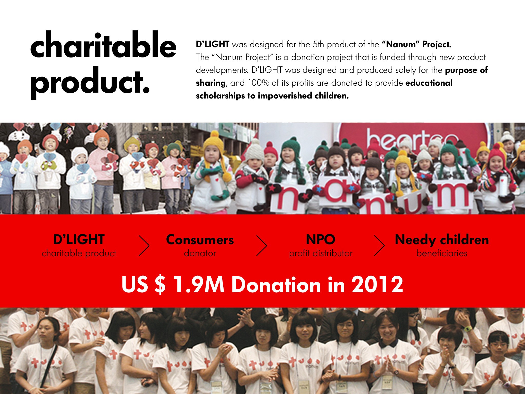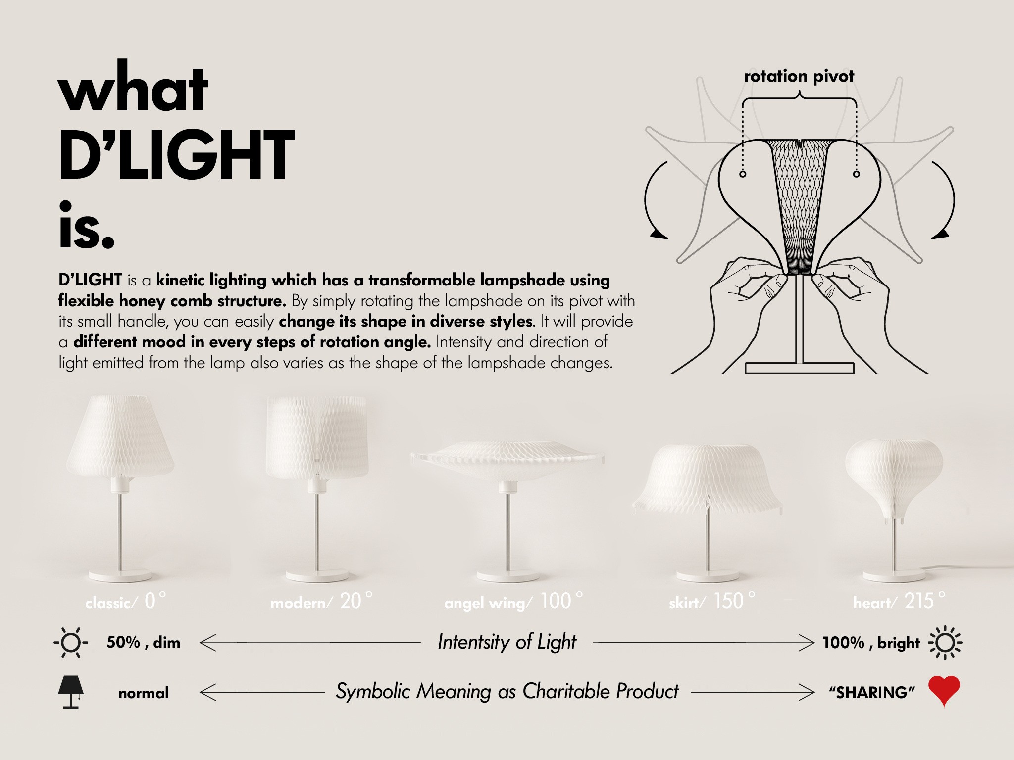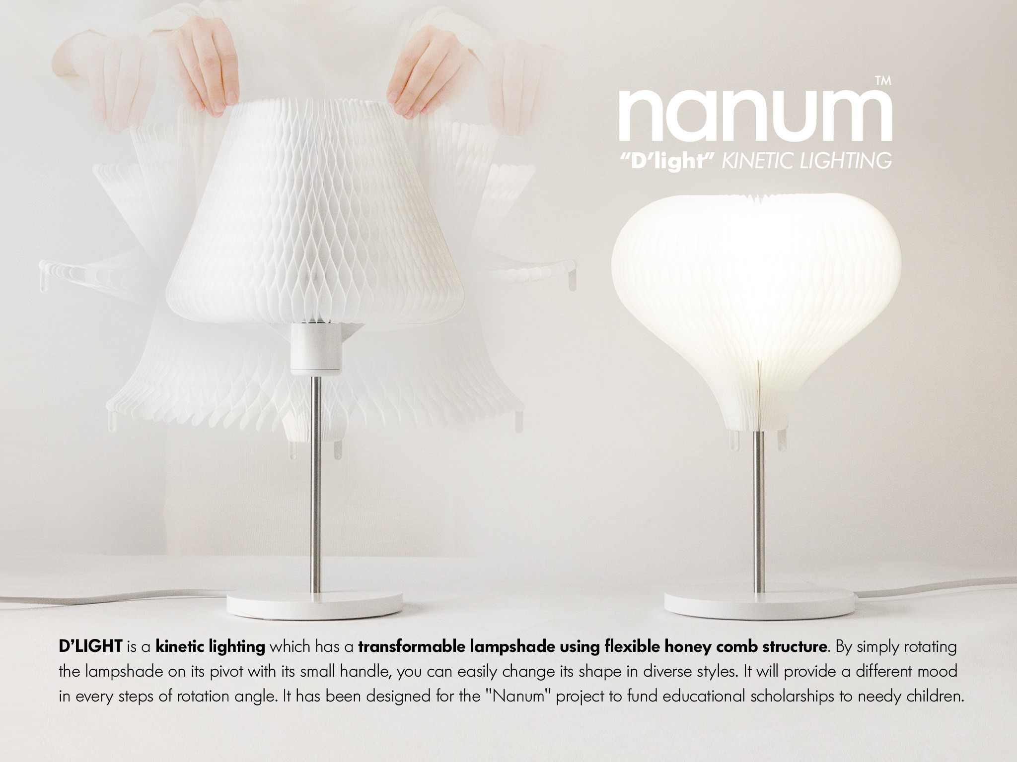 'D'light' is a kinetic lighting which has a transformable lampshade using flexible honey comb structure. By simply rotating the lampshade on its pivot with its small handle, you can easily change its shape in diverse styles. It will provide a different mood in every steps of rotation angle. Intensity and direction of light emitted from the lamp also varies as the shape of the lampshade changes. It has been designed for the "Nanum" (meaning 'sharing' in Korean) project."Nanum" is a donation project to provide educational scholarships to needy children through new product developments.