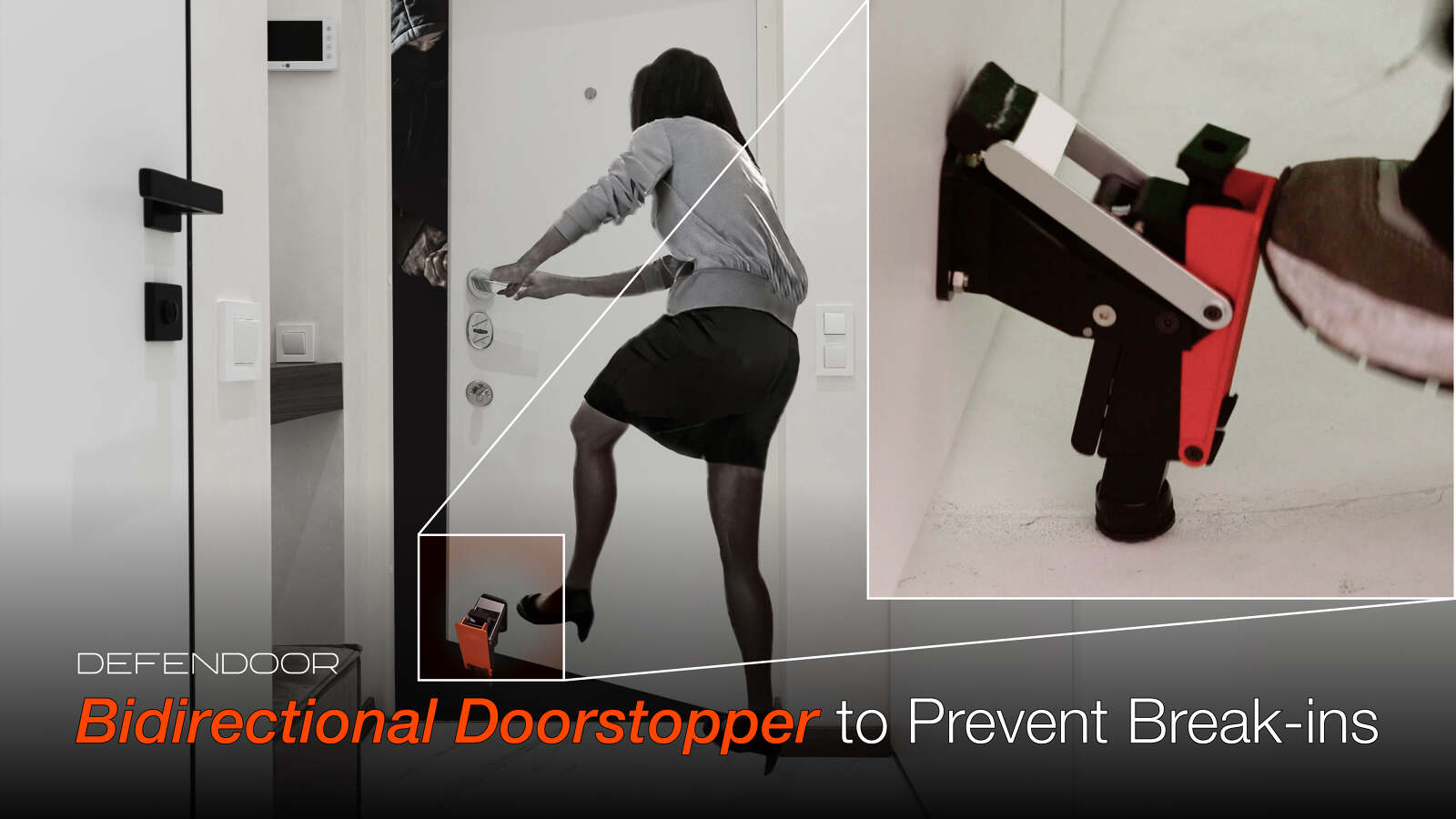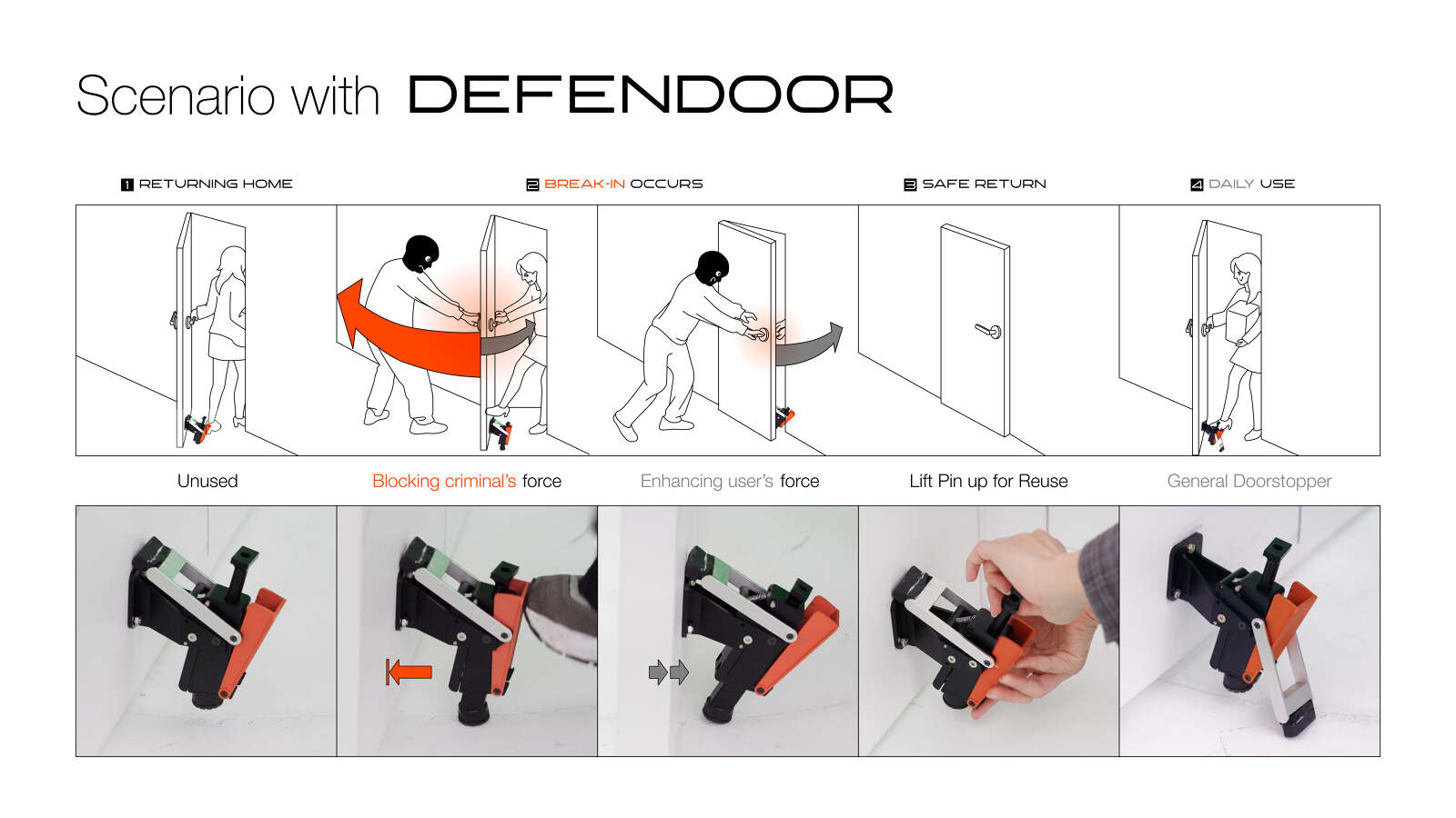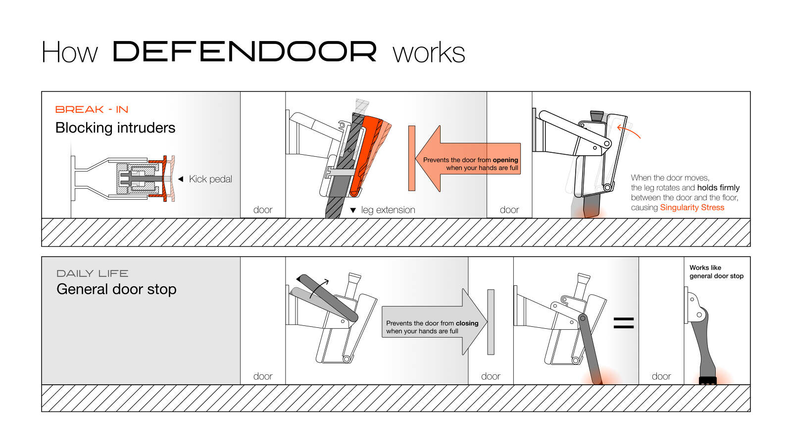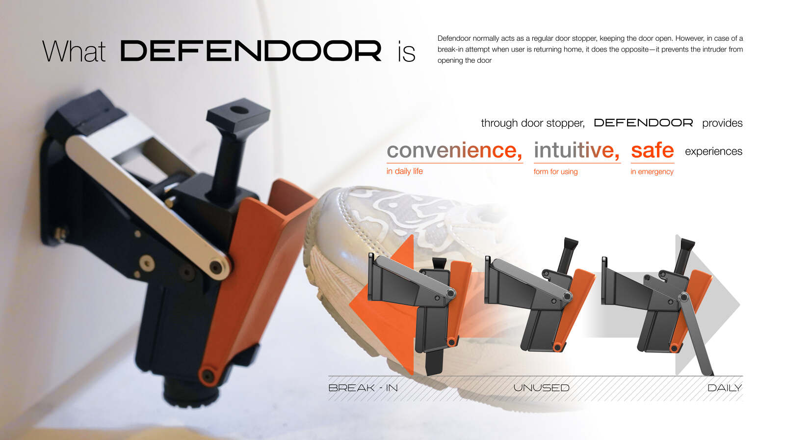 Defendoor is a door stopper that functions normally in daily use but transforms into a safety device during a break-in, preventing the door from opening. With a simple kick, it activates instantly and converts the intruder’s force into reactive momentum, making it easier to close the door. Designed for vulnerable individuals, it helps keep the home a secure sanctuary even in times of rising crime. Design with Jeongah Lee