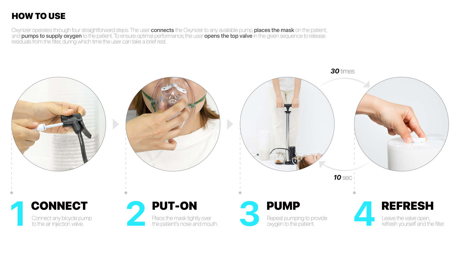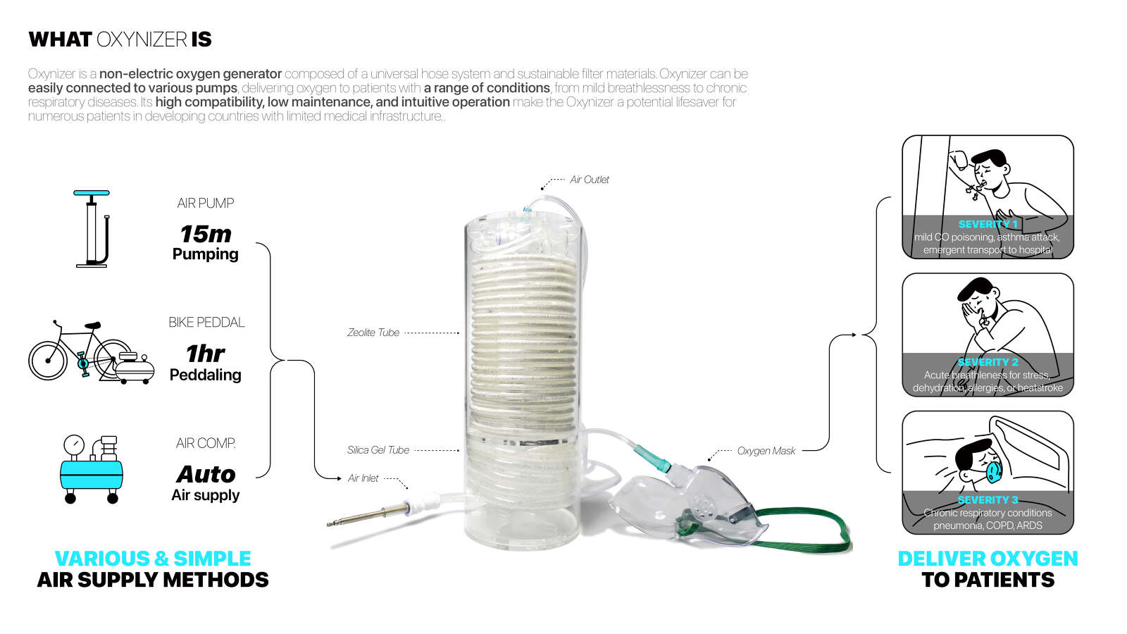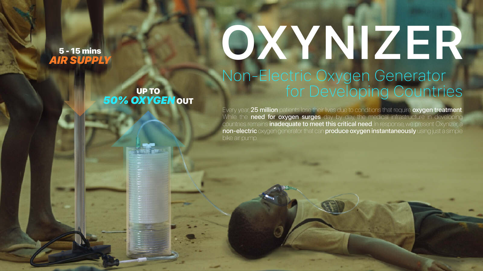 Oxynizer is a non-electric oxygen generator that works with any bicycle pump to quickly produce and deliver oxygen to patients. In many developing countries where medical infrastructure is limited, oxygen shortages are a critical issue, causing over 130,000 deaths in Africa during the COVID-19 pandemic. Oxynizer addresses this by generating oxygen that is 1.5 to 2 times purer than the air pumped through an efficient three-step process: compression, filtration, and refreshing. Once deployed, Oxynizer provides sustainable use with its semi-permanent filter materials that are reused by simple heating, and its universal hose system that is widely accessible. Design with Jiwon Kim, Kyeongho Park, Seung-Jun Lee, Jiwon Lee, and Yeohyeon Jeong