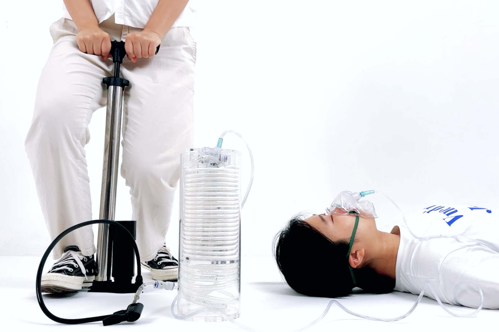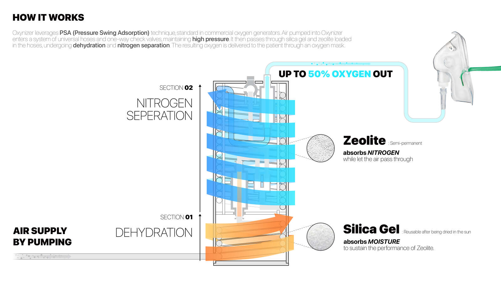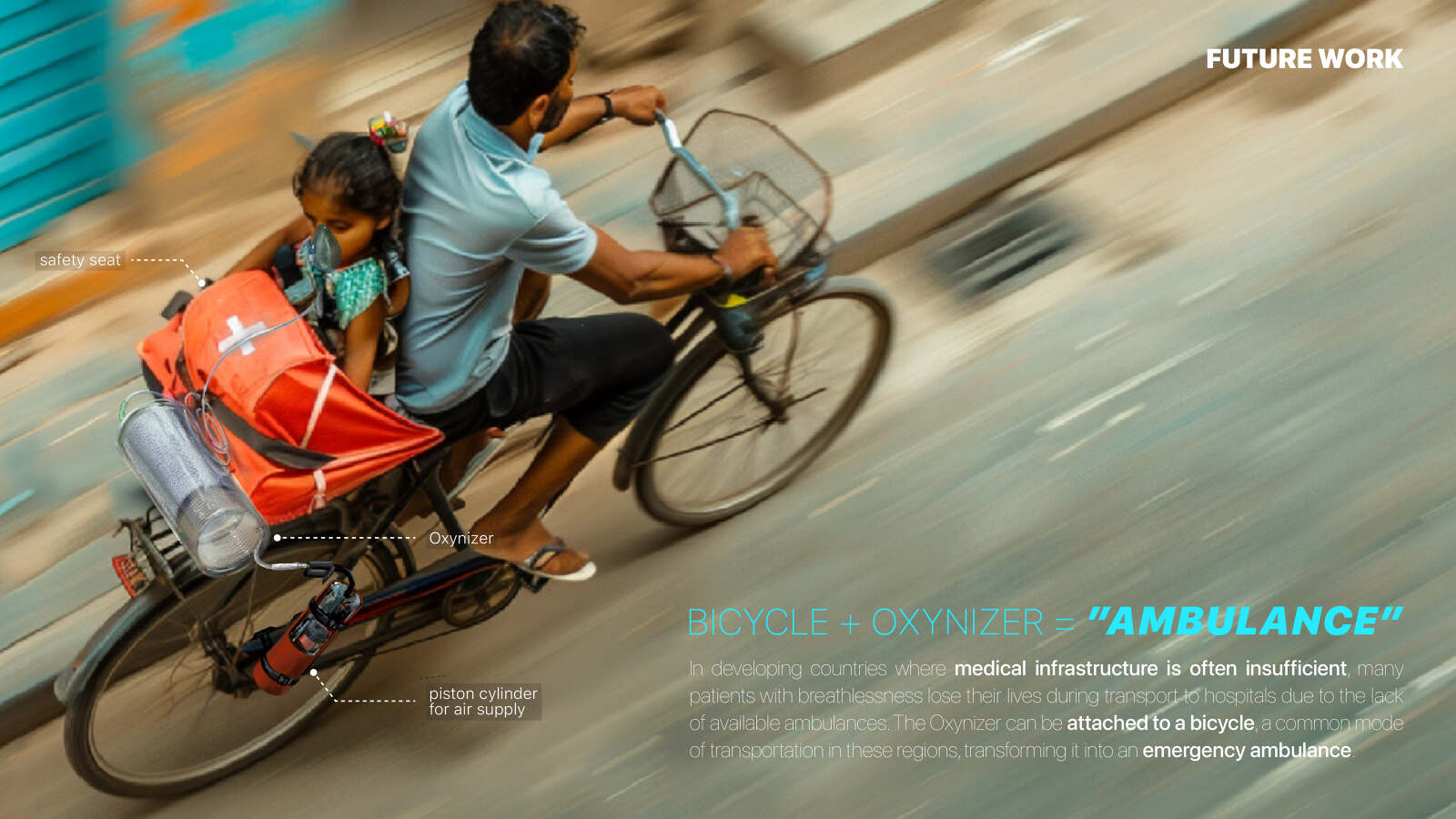 Oxynizer is a non-electric oxygen generator that works with any bicycle pump to quickly produce and deliver oxygen to patients. In many developing countries where medical infrastructure is limited, oxygen shortages are a critical issue, causing over 130,000 deaths in Africa during the COVID-19 pandemic. Oxynizer addresses this by generating oxygen that is 1.5 to 2 times purer than the air pumped through an efficient three-step process: compression, filtration, and refreshing. Once deployed, Oxynizer provides sustainable use with its semi-permanent filter materials that are reused by simple heating, and its universal hose system that is widely accessible. Design with Jiwon Kim, Kyeongho Park, Seung-Jun Lee, Jiwon Lee, and Yeohyeon Jeong