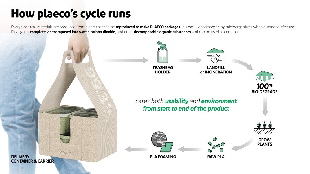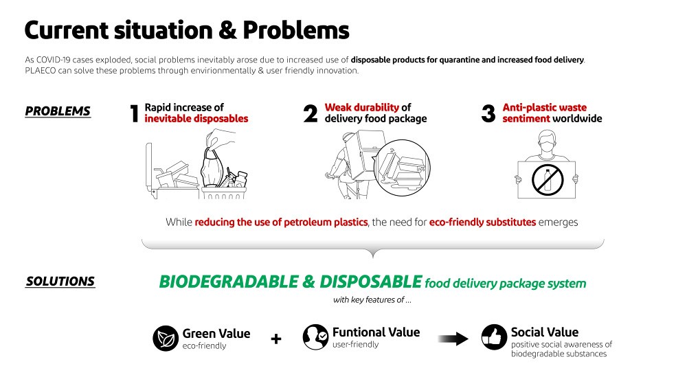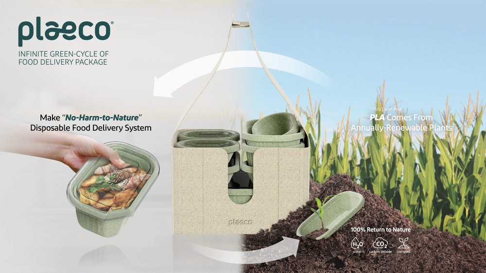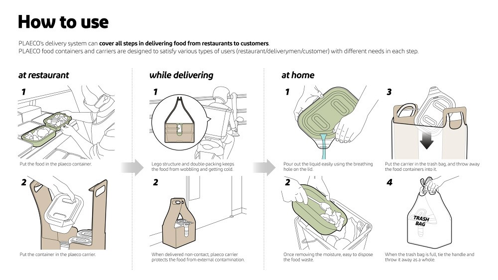 PLAECO is a delivery food package system made of PLA, which is bio-degradable resin that can replace petroleum-based plastics. PLA is made of 99.3% nature-derived raw materials and returns to 100% nature by being decomposed by microorganisms after use. When completely decomposed into water, carbon dioxide, and other decomposable organic substances, it can be used as compost. PLAECO’s delivery packages, consisting of containers and carriers, are made of highly-insulated foam PLA. Secure delivery is possible through a Lego-structured stacking system. A hole with a hinged door is located at the corner of the lid so that user can throw away the leftover soup easily. The carrier is used as a trash bag holder to facilitate the disposal of garbage after meal. PLAECO can cover all steps in delivering food from restaurants to customers. It is designed to satisfy various types of users (restaurant/deliverymen/customer) with different needs in each step.