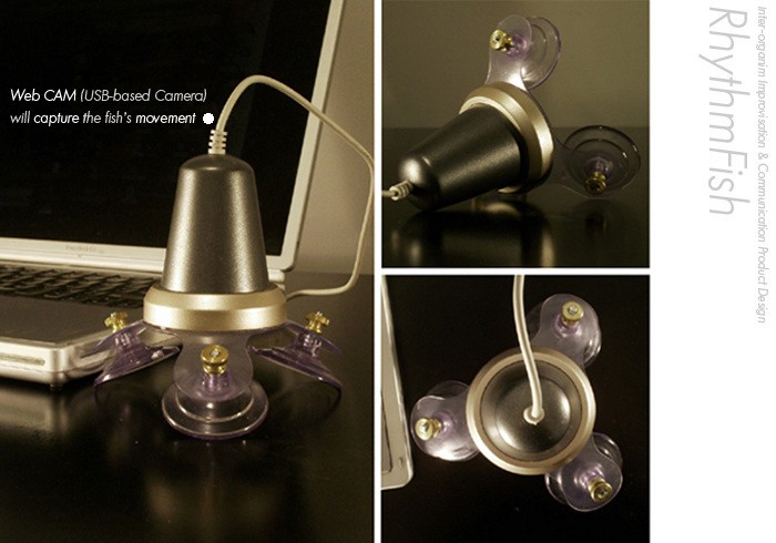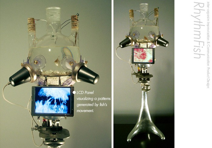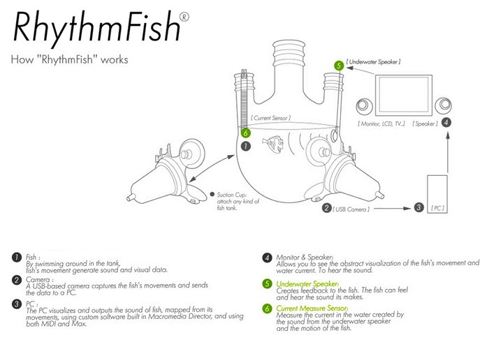 RhythmFish is a device that explores the many aspects of biosonic infrasonic sound. Video capture from outside the tank is combined with the data from flow sensors inside the tank (measuring currents caused by the fish’s swimming patterns). These inputs are combined to create audio and video output. Bae suggests that, “even if the fish can’t speak and express its feelings in a human way, it has an energy and communication skill in its own way. Vibration is the medium of interaction, and I chose it for its universality in the physical, emotional, and spiritual realms.”