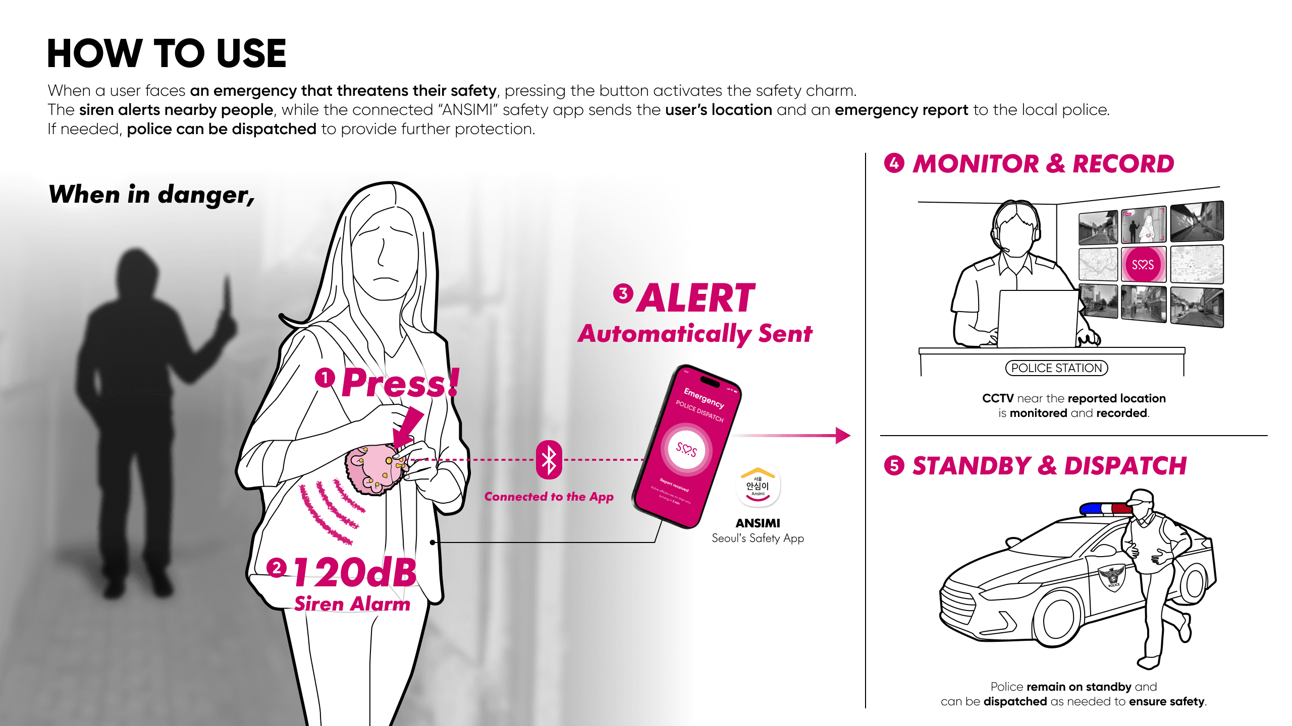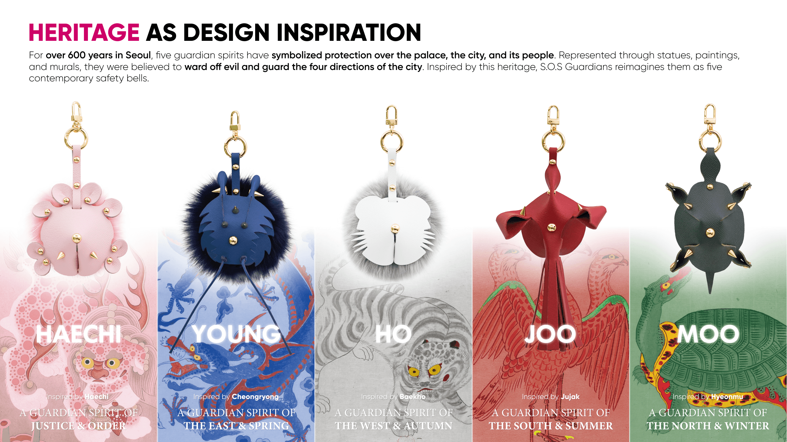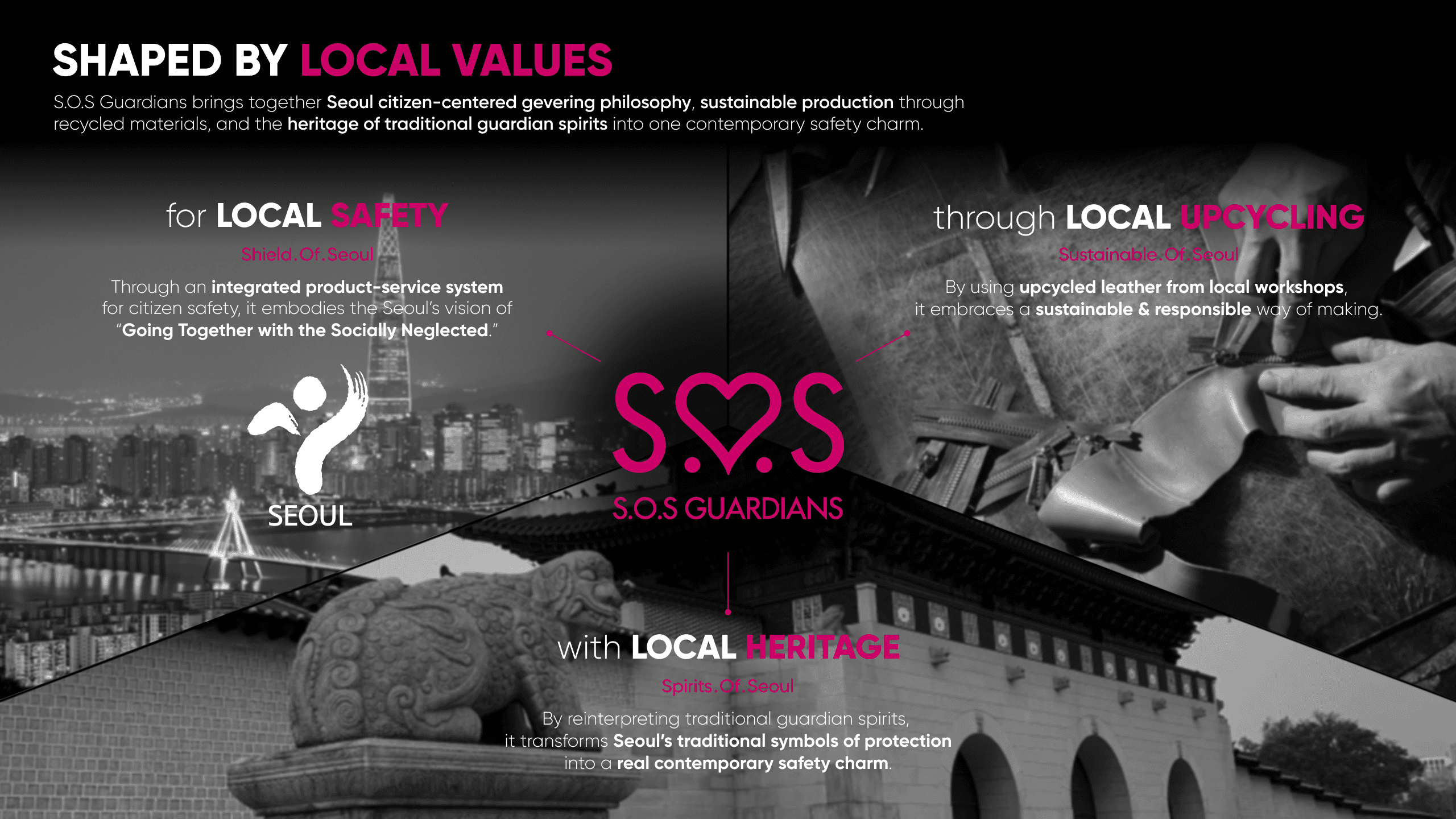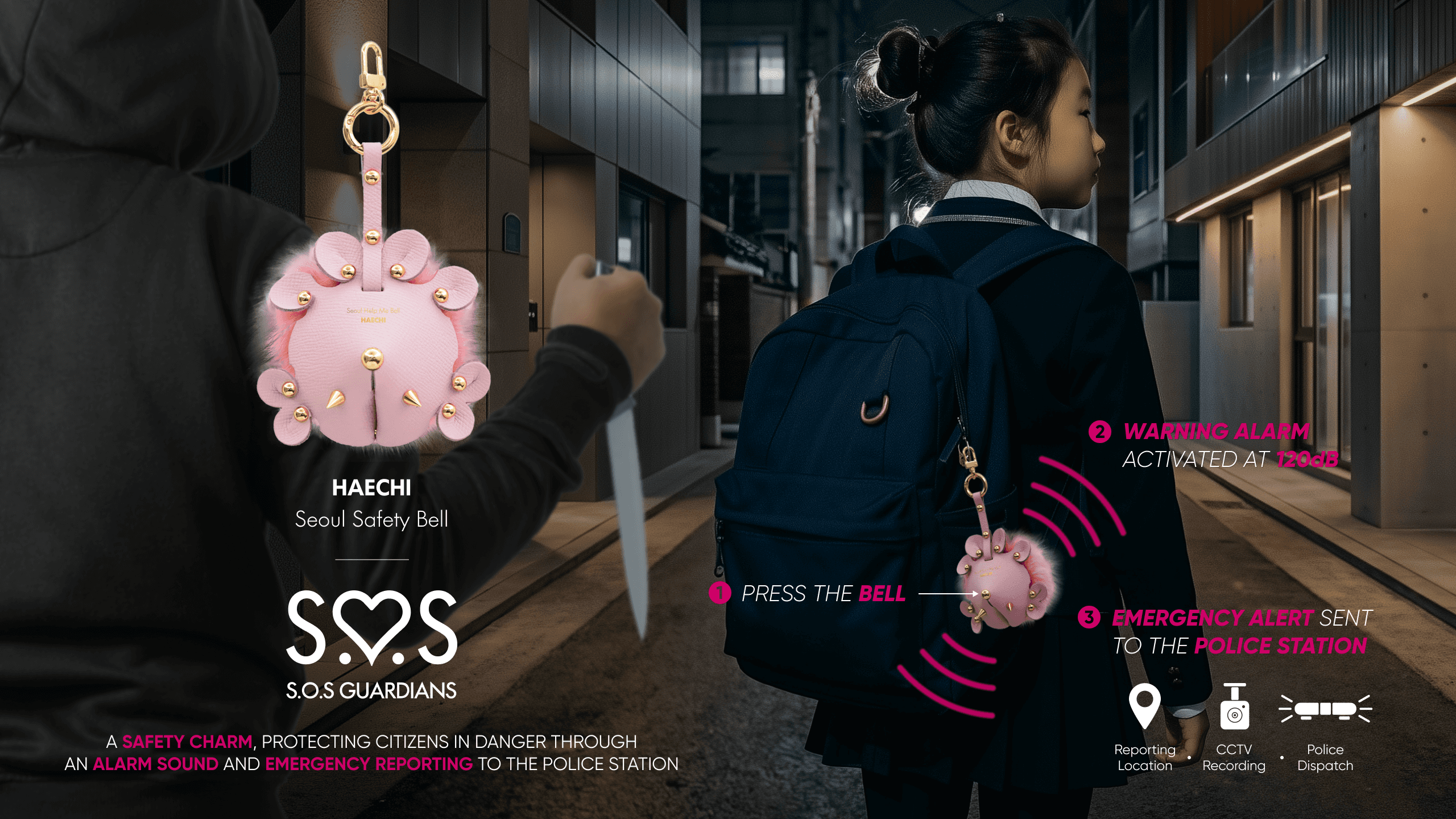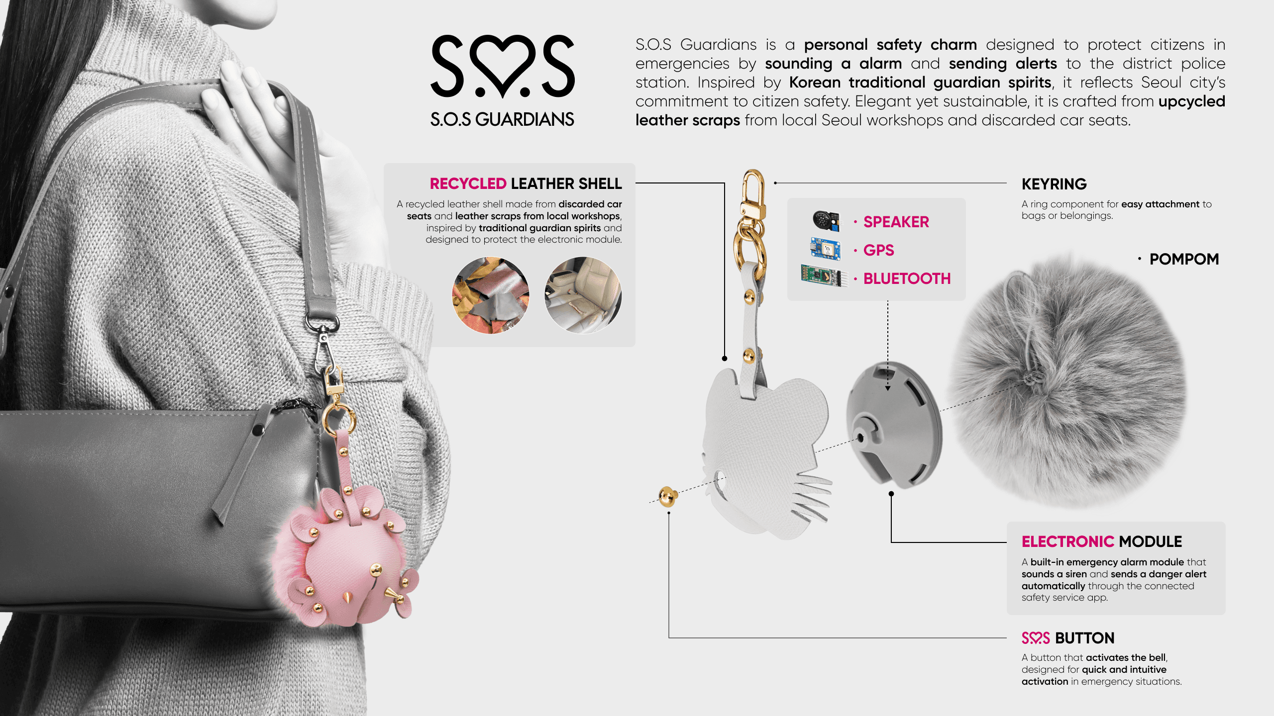 S.O.S Guardians is a safety charm that protects citizens in danger through an alarm sound and emergency reporting to the police in Seoul, Korea. Inspired by Haechi and the Four Guardian Spirits, it reimagines protection as a charming everyday object that can be attached to a bag or personal belonging. The design combines an S.O.S button, a leather guardian shell, an electronic unit, and a pompom detail to create a refined souvenir with daily appeal. When pressed, it activates a bell siren and sends location and emergency information through a connected app. Made from upcycled leather scraps from local Seoul workshops and discarded car seat leather, it brings together citizen safety, local heritage, and sustainable making.