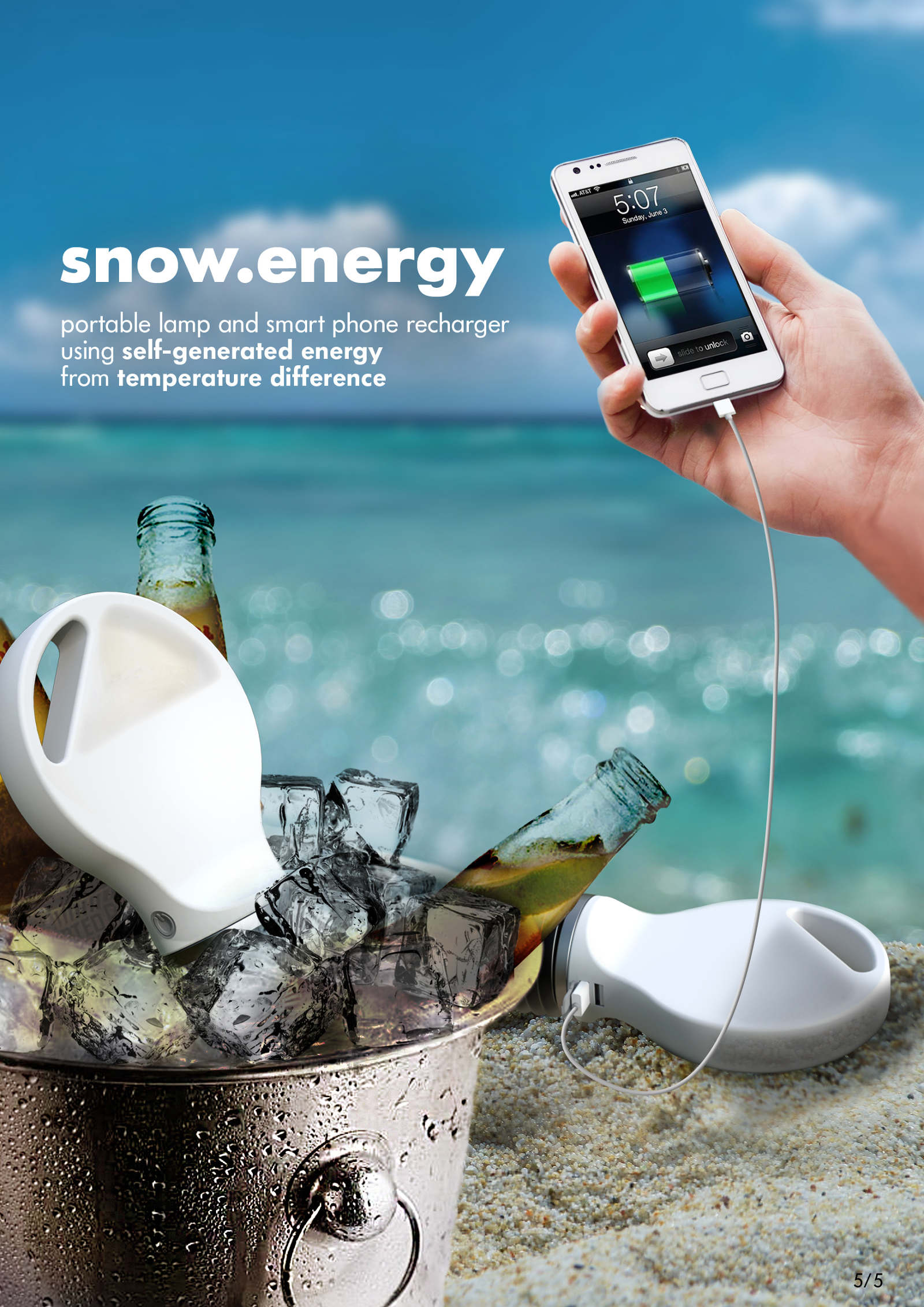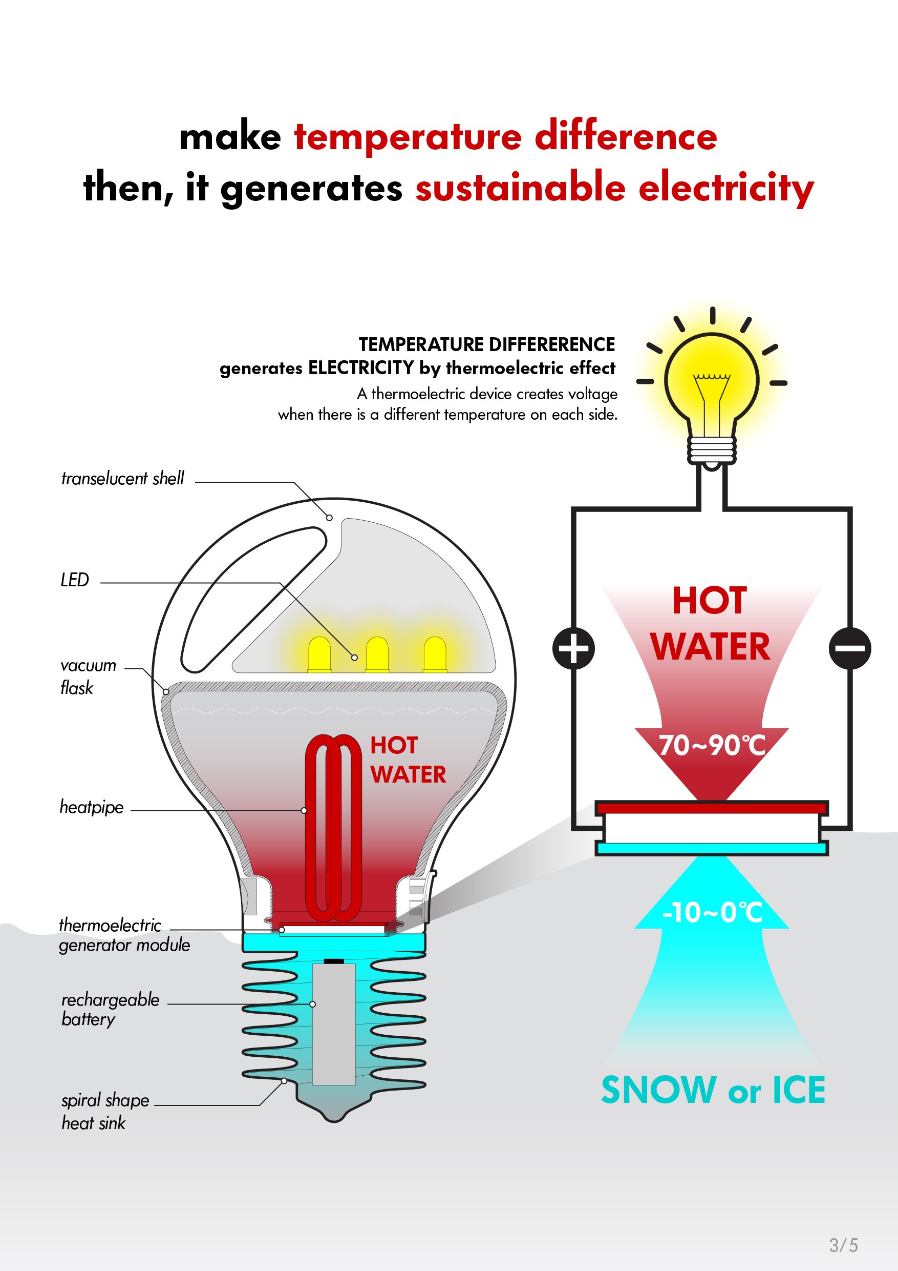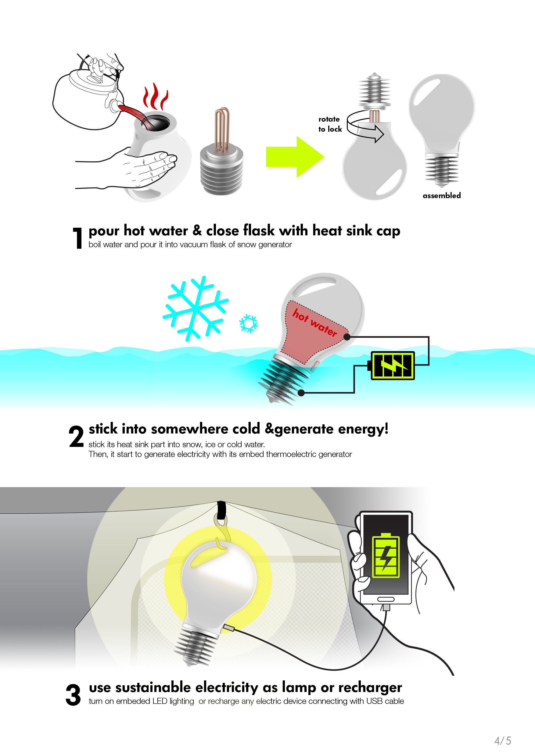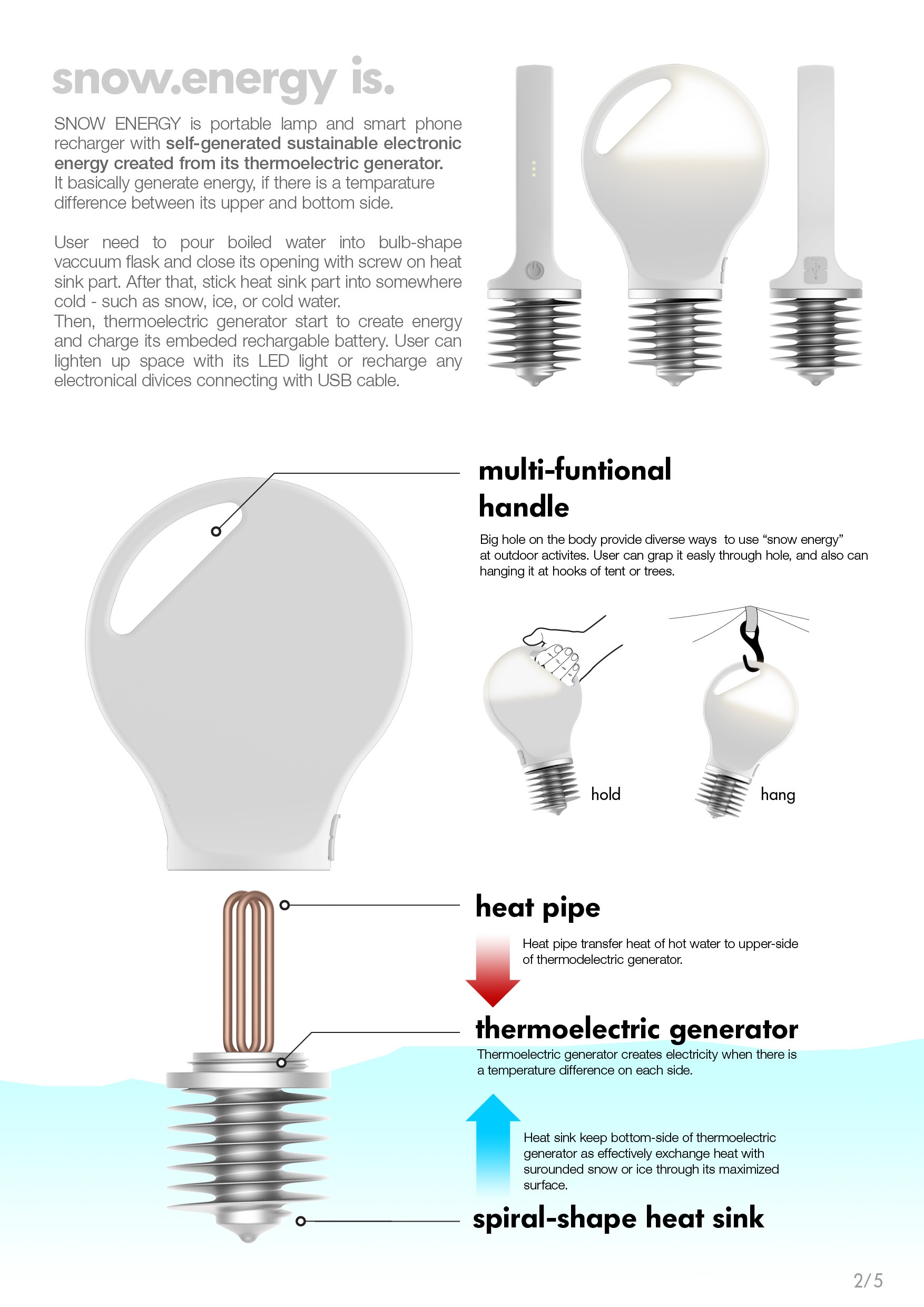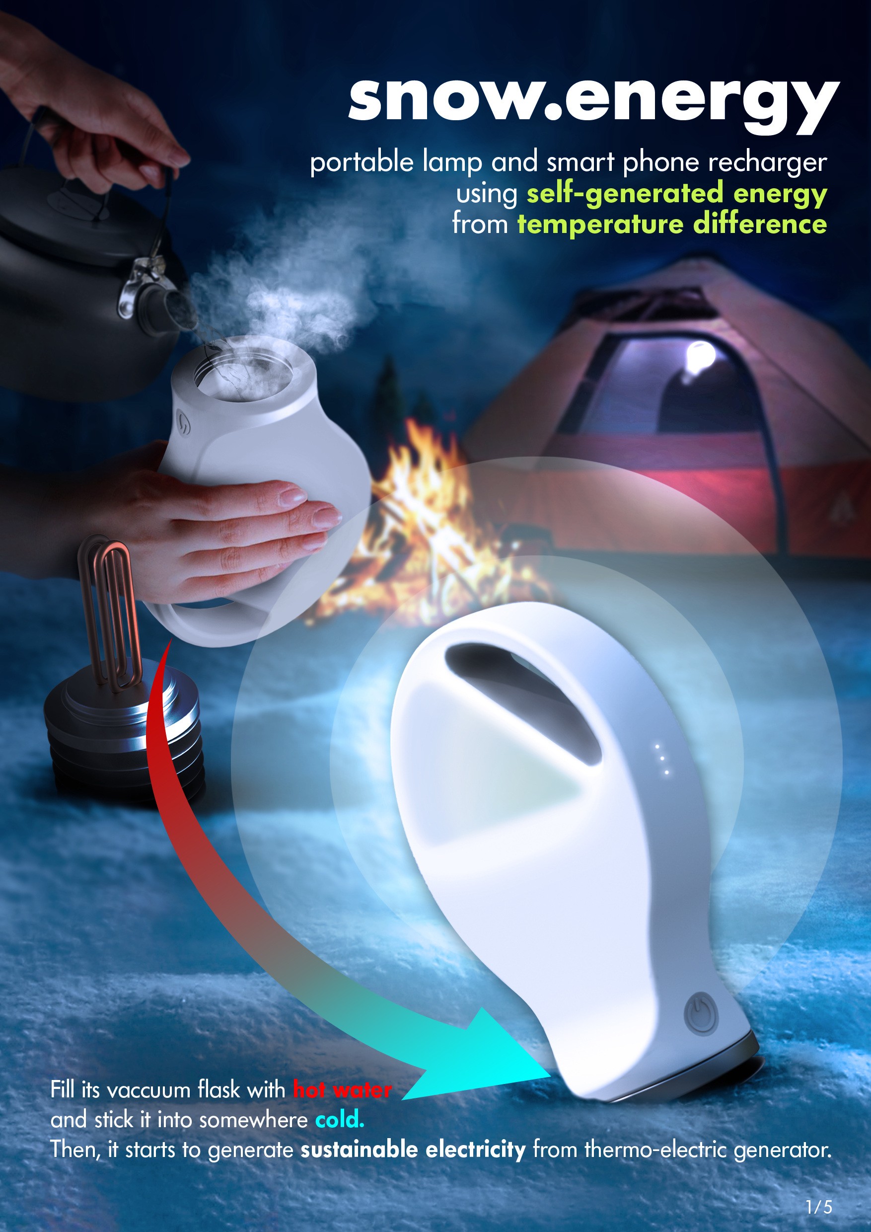 SNOW ENERGY is portable lamp and smart phone recharger with sustainable electronic energy created from its thermoelectric generator. It basically generates energy, if there is a temperature difference between its upper and bottom side. User need to pour boiled water into bulb-shape vacuum flask and close its opening with screw on heat sink part. After that, stick heat sink part into somewhere cold - like snow, ice, and cold water. Then, thermoelectric generator starts to create energy and charge its embedded rechargeable battery. User can lighten up space with its LED light or recharge any electronic devices connecting with USB cable.