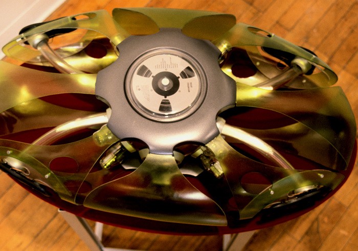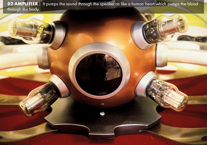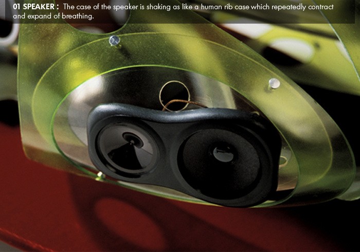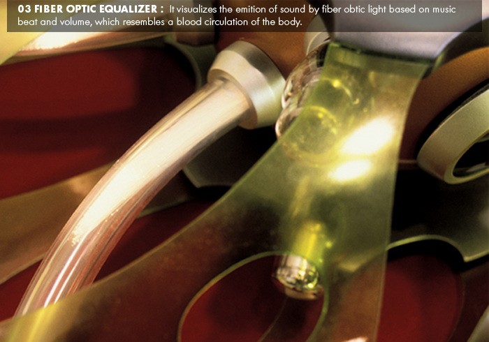 Sound Pump is a human interactive audio system. All component shapes and functions come from human’s inter-organ, Ribcage, Heart, Blood-circulation. It pumps a sound same as the heart pumps the blood. 4-connected tube from the amplifier to speaker emits a different length and color of a fiber optic light base on sound’s volume and beat. Outer case which is metaphor of human’s ribcage and made of a flexible plastic (VIREX) is shook and vibrated by a sound.