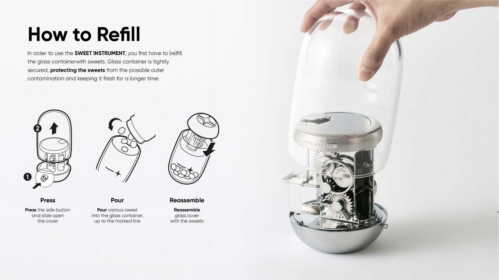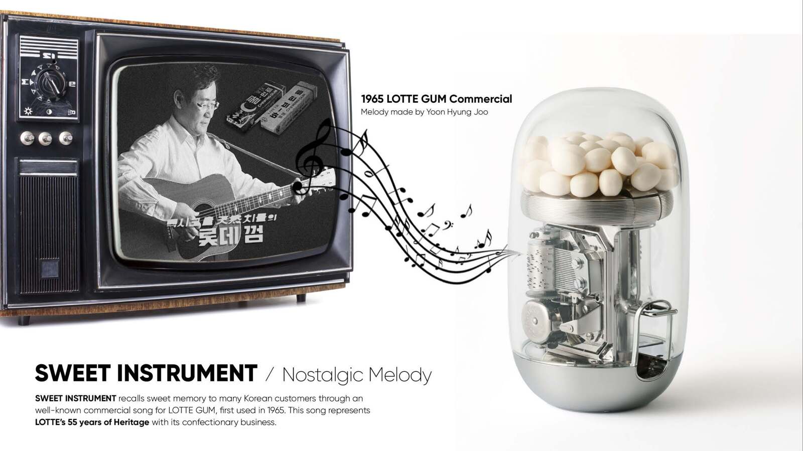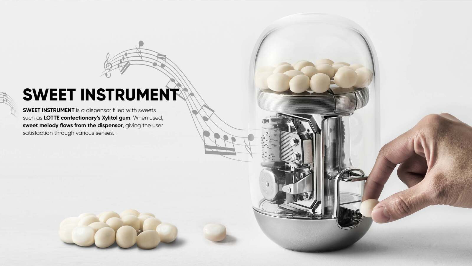 South Korea's 5th largest company, LOTTE's business; distribution, food and tourism, all started from chewing gum sales in 1967. LOTTE chewing gum is understood as the founding root of LOTTE's global business and carries great symbolism. When the handle is turned on the XYLITOL Music Box, a nostalgic jingle starts to play and dispenses a LOTTE chewing gum. It presents a multi-sensorial experience of watching the gears turn while enjoying the taste of the gum with the delightful acoustic music. 'XYLITOL Music Box' elevates the experience of eating sweets while making consumers instinctively contextualize the 55 years of LOTTE's heritage.