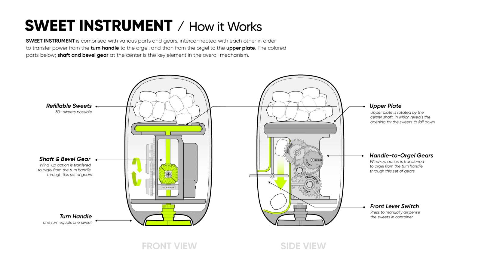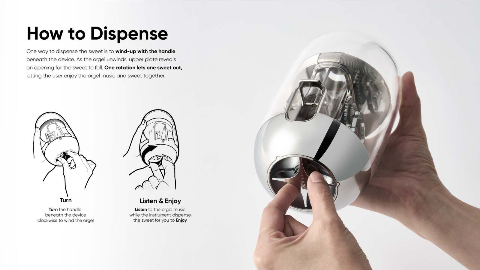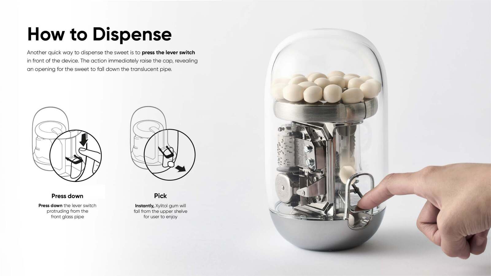 South Korea's 5th largest company, LOTTE's business; distribution, food and tourism, all started from chewing gum sales in 1967. LOTTE chewing gum is understood as the founding root of LOTTE's global business and carries great symbolism. When the handle is turned on the XYLITOL Music Box, a nostalgic jingle starts to play and dispenses a LOTTE chewing gum. It presents a multi-sensorial experience of watching the gears turn while enjoying the taste of the gum with the delightful acoustic music. 'XYLITOL Music Box' elevates the experience of eating sweets while making consumers instinctively contextualize the 55 years of LOTTE's heritage.