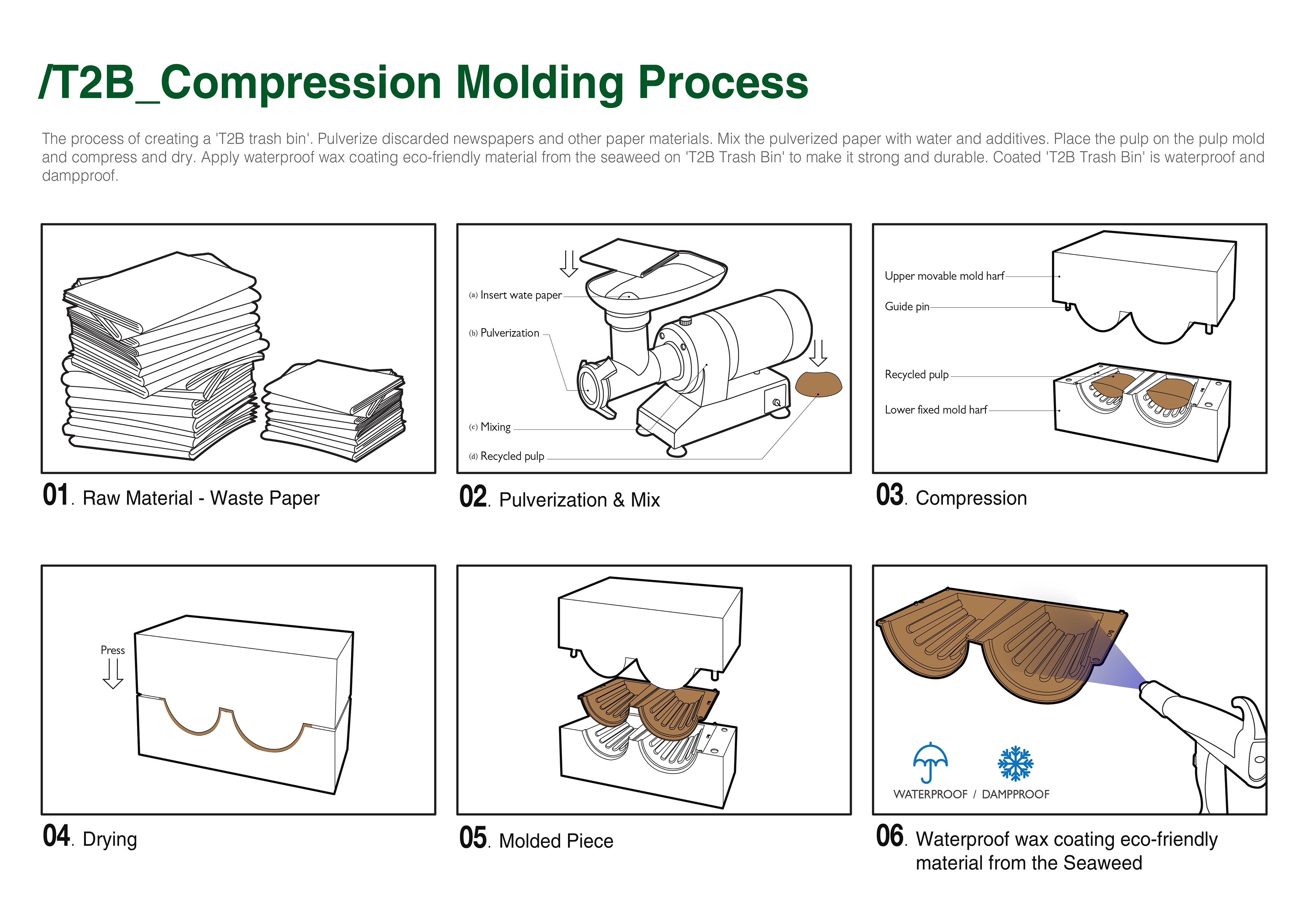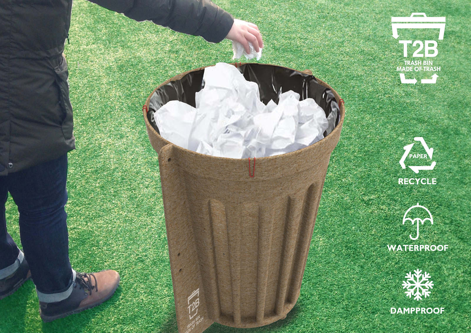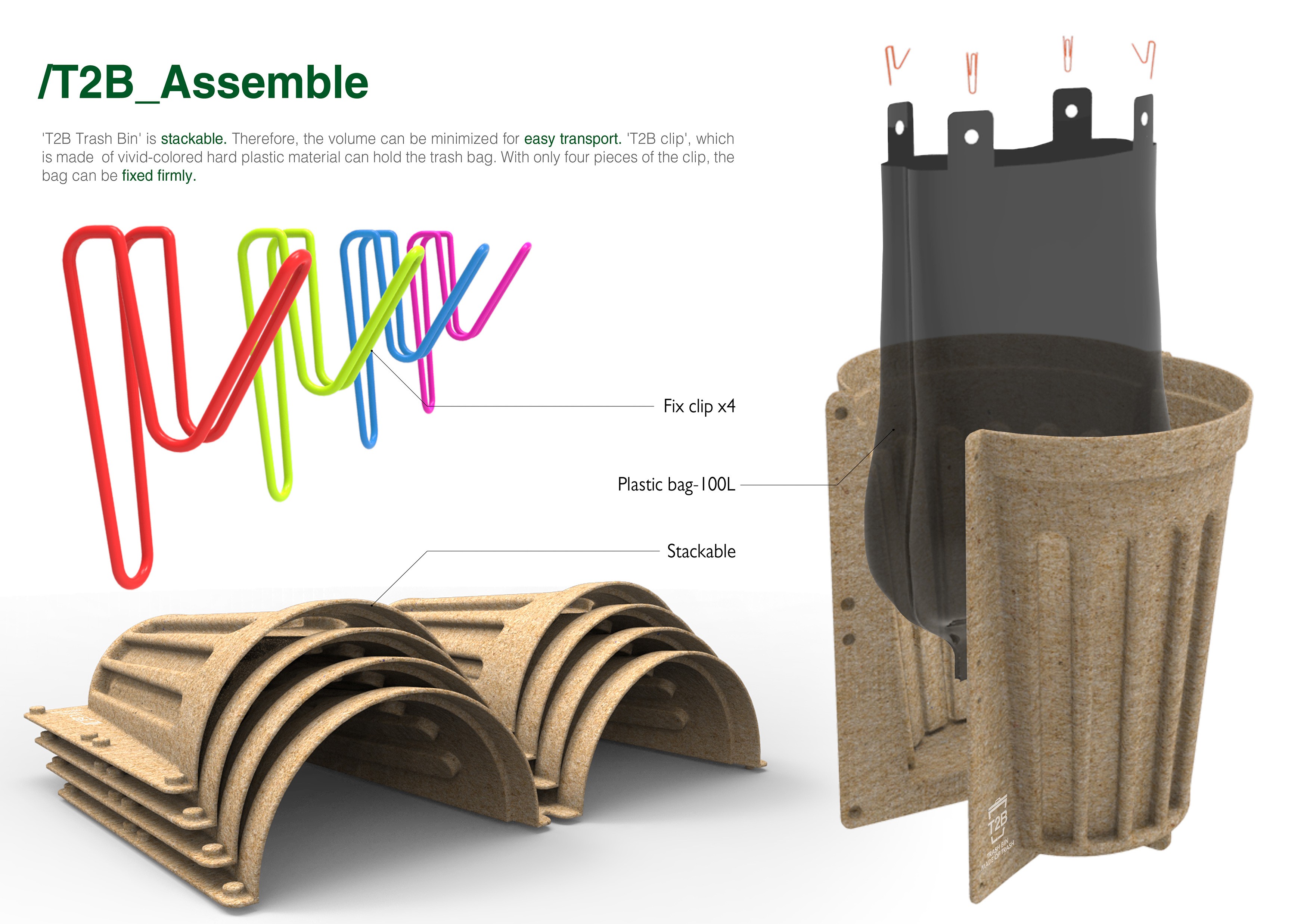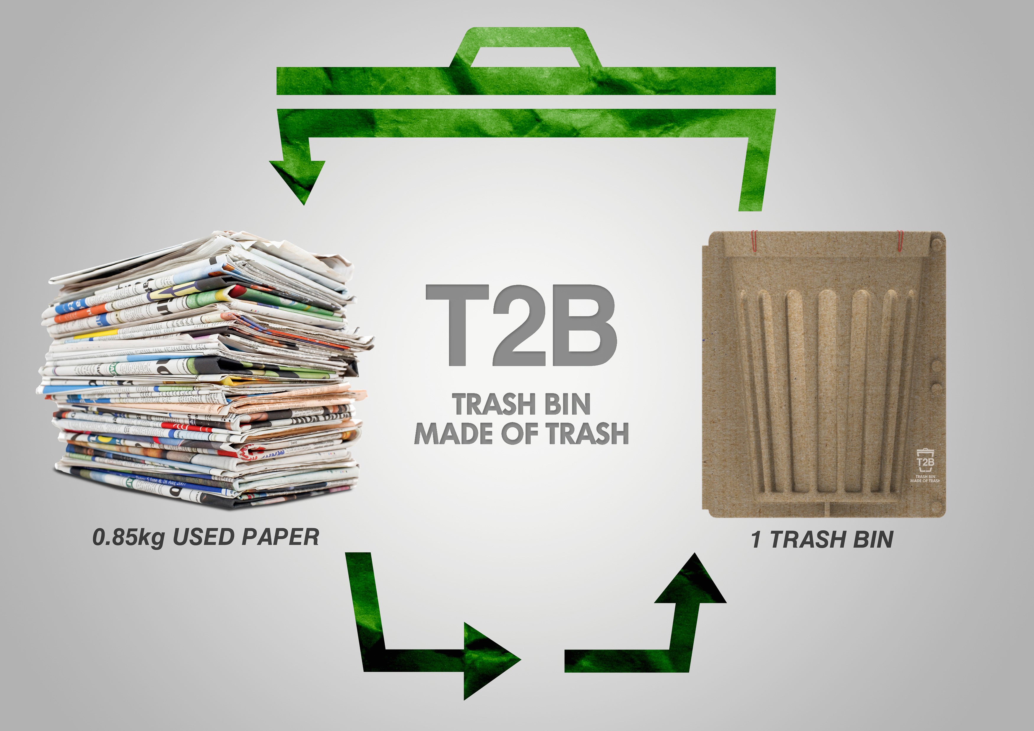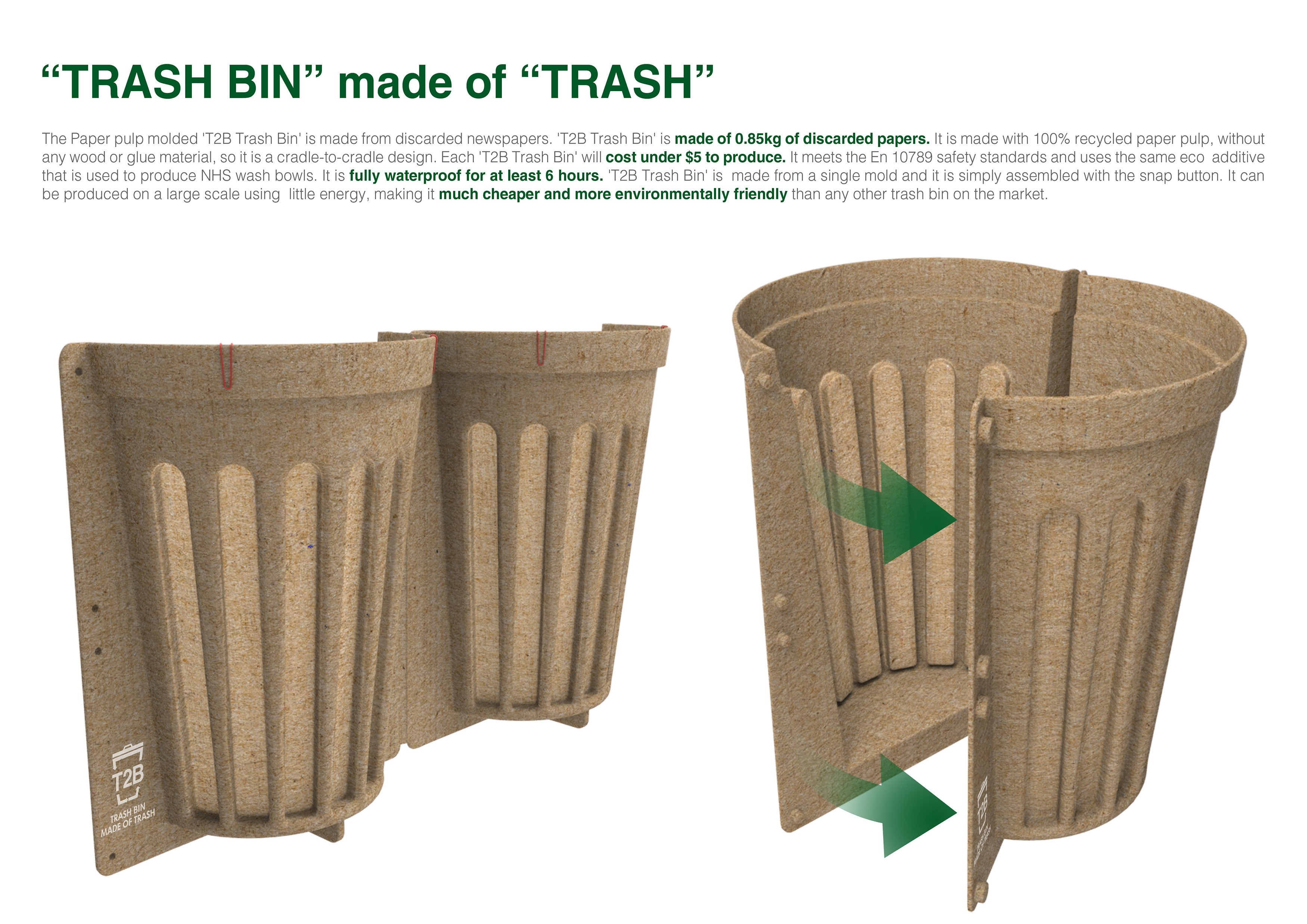 'T2B Trash Bin' is made of 0.85kg of discarded papers. It is made with 100% recycled paper pulp, without any wood or glue material, so it is a cradle-to-cradle design. Each 'T2B Trash Bin' will cost under $5 to produce. It meets the En 10789 safety standards and uses the same eco additive that is used to produce NHS wash bowls. It is fully waterproof for at least 6 hours. 'T2B Trash Bin' is made from a single mold and it is simply assembled with the snap button. It can be produced on a large scale using little energy, making it much cheaper and more environmentally friendly than any other trash bin on the market.