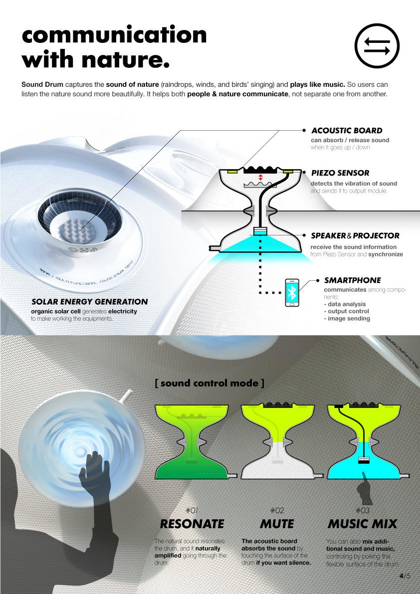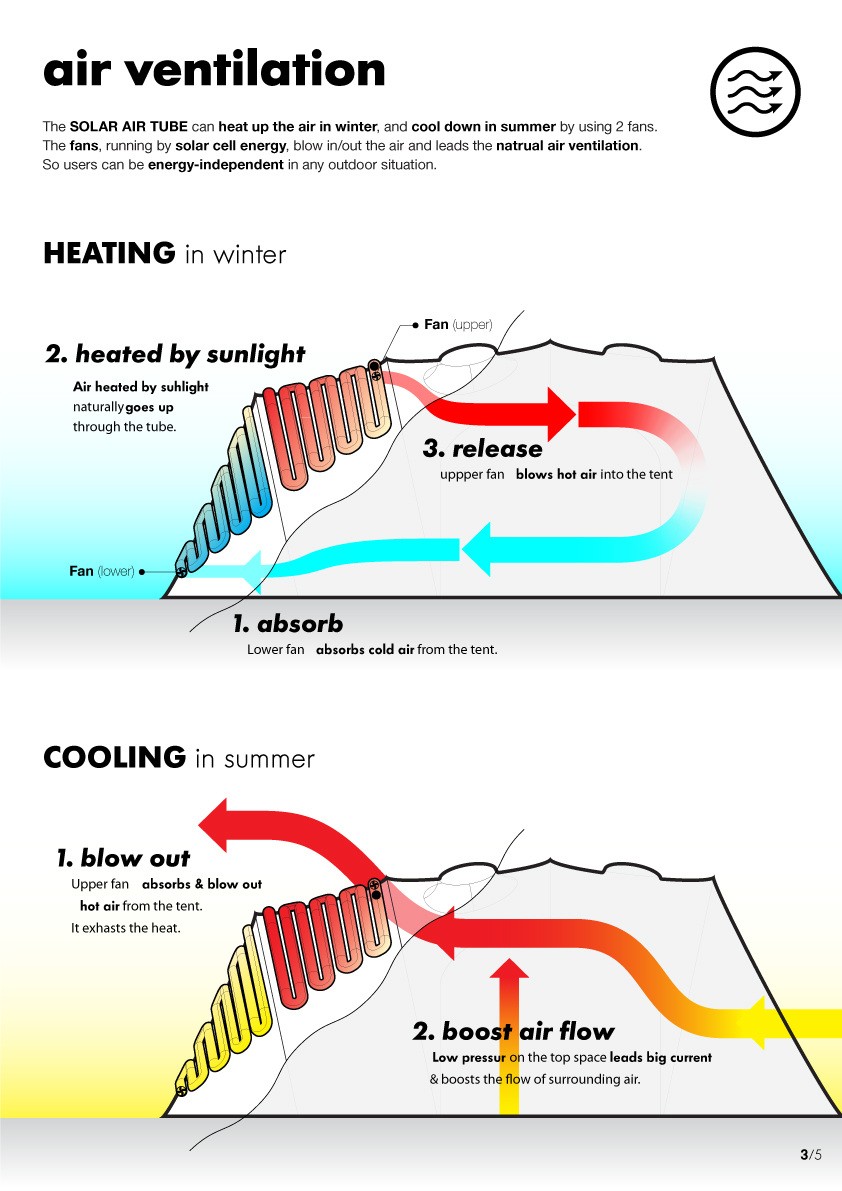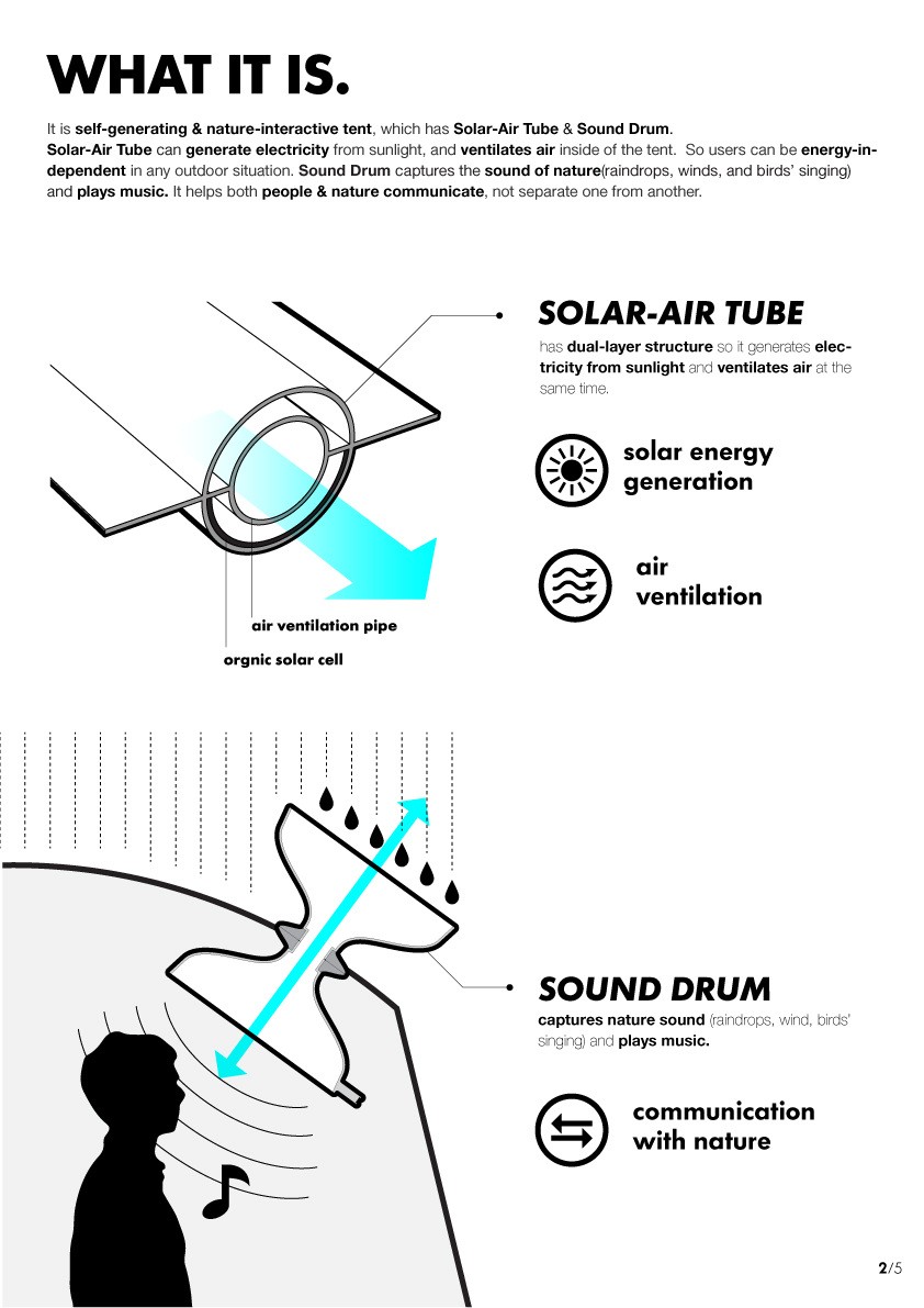 Traditional outdoor tents were first used as temporal shelter to endure environment. However, not only people want to be protected from the outdoor environment, people want to interact with nature nowadays. Tent 3.0 is designed to fulfill the need of tent users who looks for new outdoor experience and rich interaction with nature. It has a Sound drum on the top which is natural-interactive acoustic system for emotional experience in nature. The window, called Magic window, delivers limitless outdoor experience to the tent as virtual reality. Hybrid tube attracted on the backside of tent optimizes inside air condition of the tent and it generates solar power for independent outdoor life. On the Interactive tent fly, hydro-chromic ink is applied; the color of tent is changed in rainy day. Therefore, Tent 3.0 is the new generation of tent for innovative outdoor life.