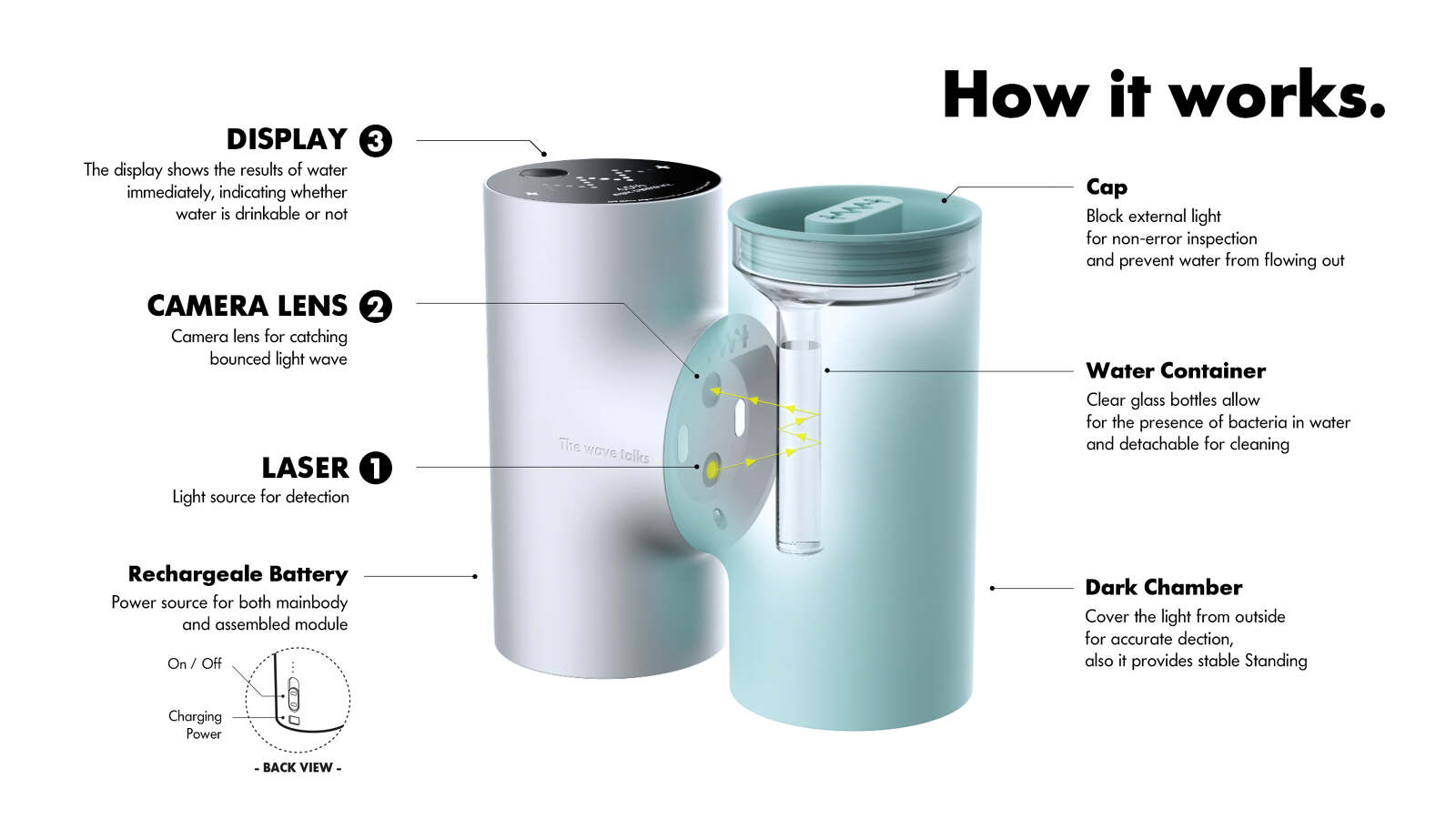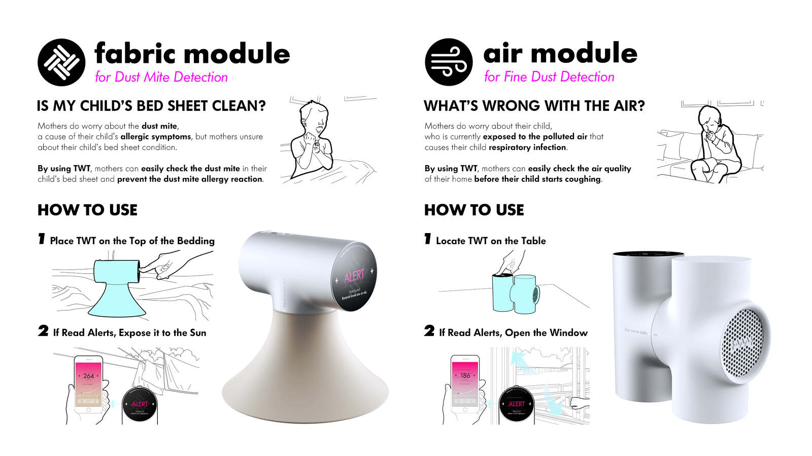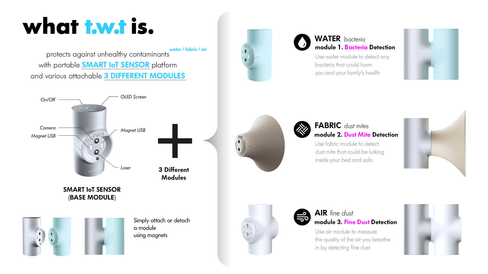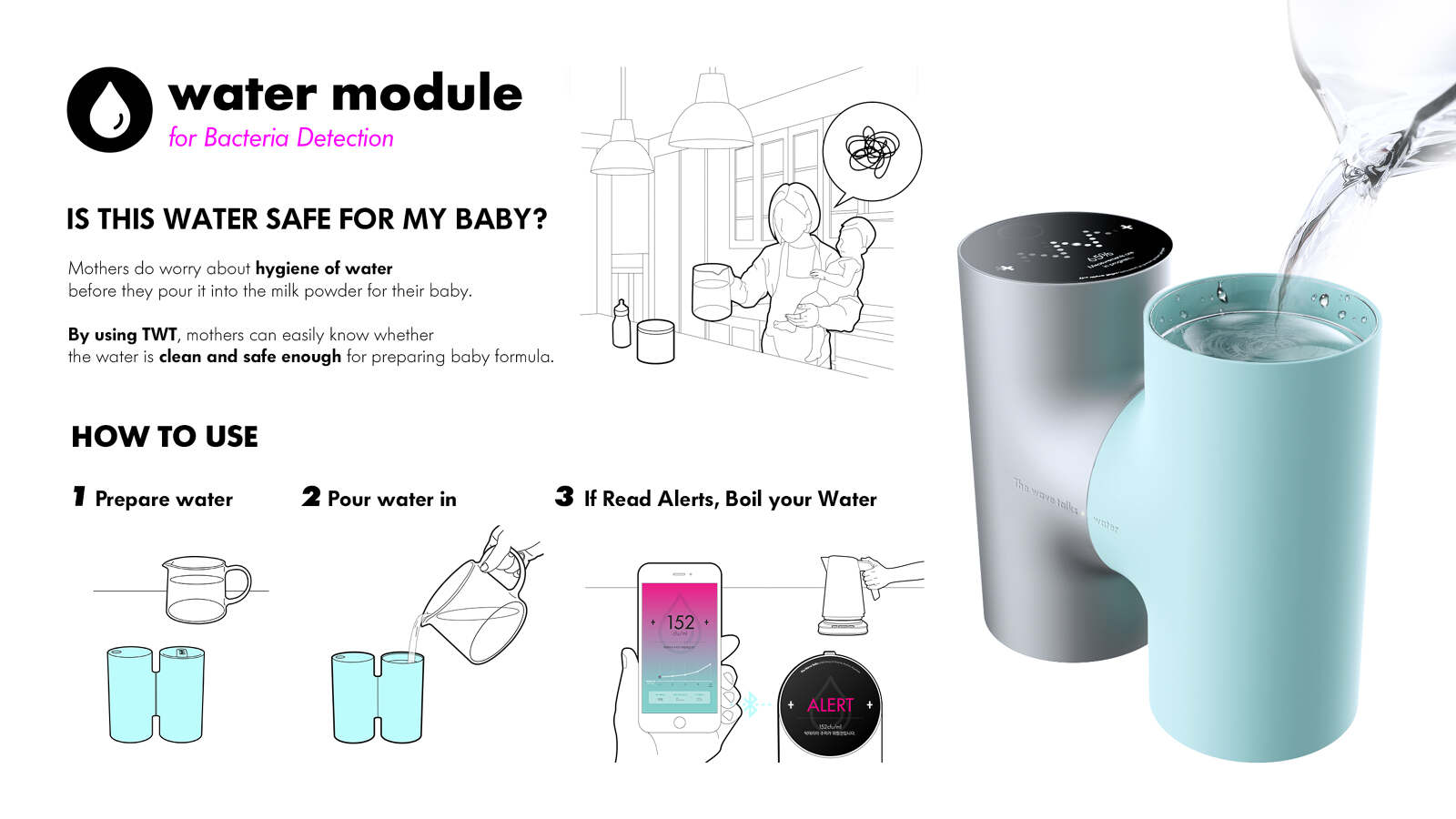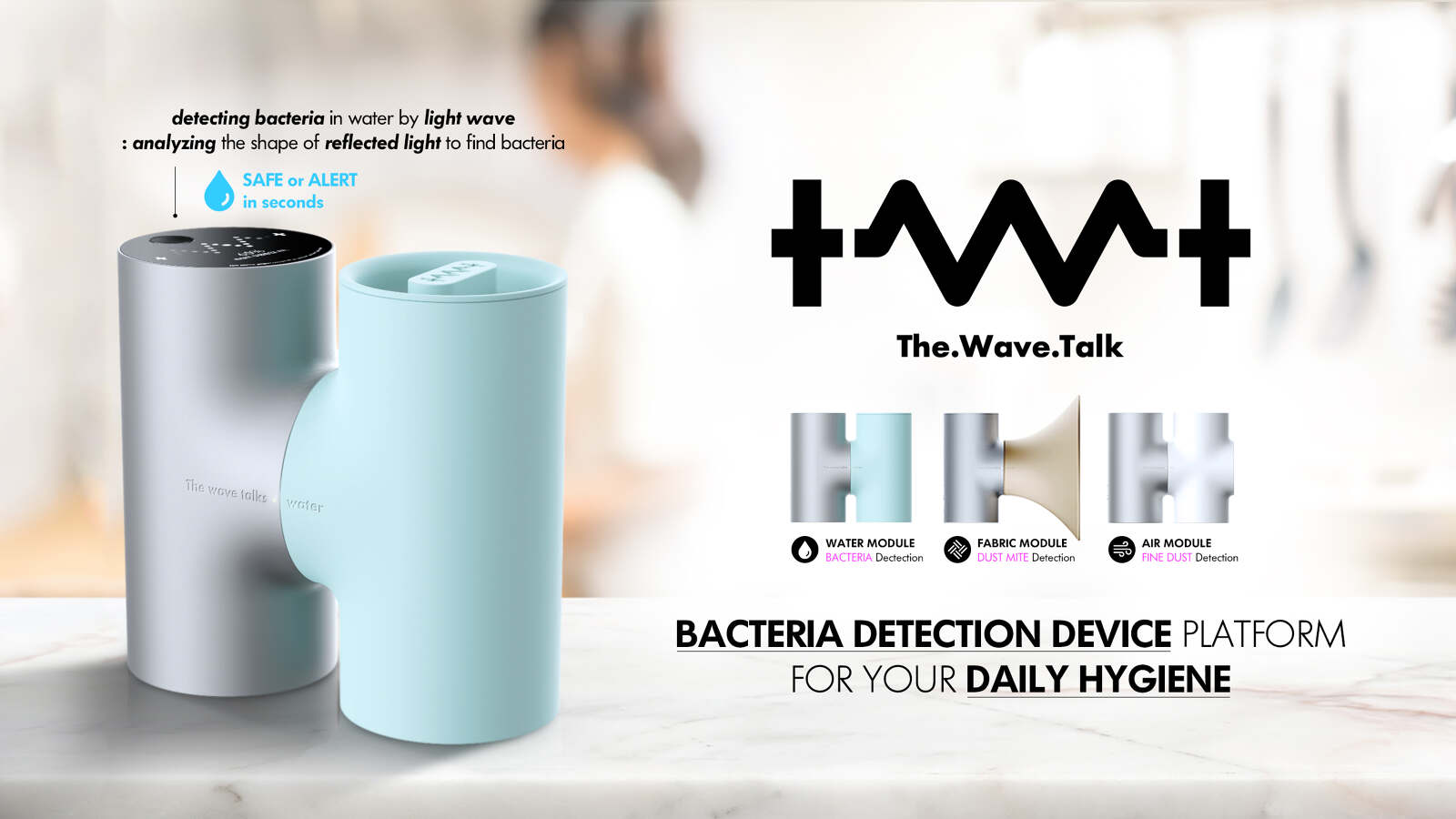 TWT is a bacteria detection device platform based on a patented method for detecting bacteria using the properties of light. It could analyze the shape of light projection in water to detect the bacteria. The same technology could be also used to analyze the reflected light from the fabric and air to detect dust mites and fine dust particles. With a simple and easy-to-use design, TWT can work as a bacteria detection device platform for daily hygiene for any household.