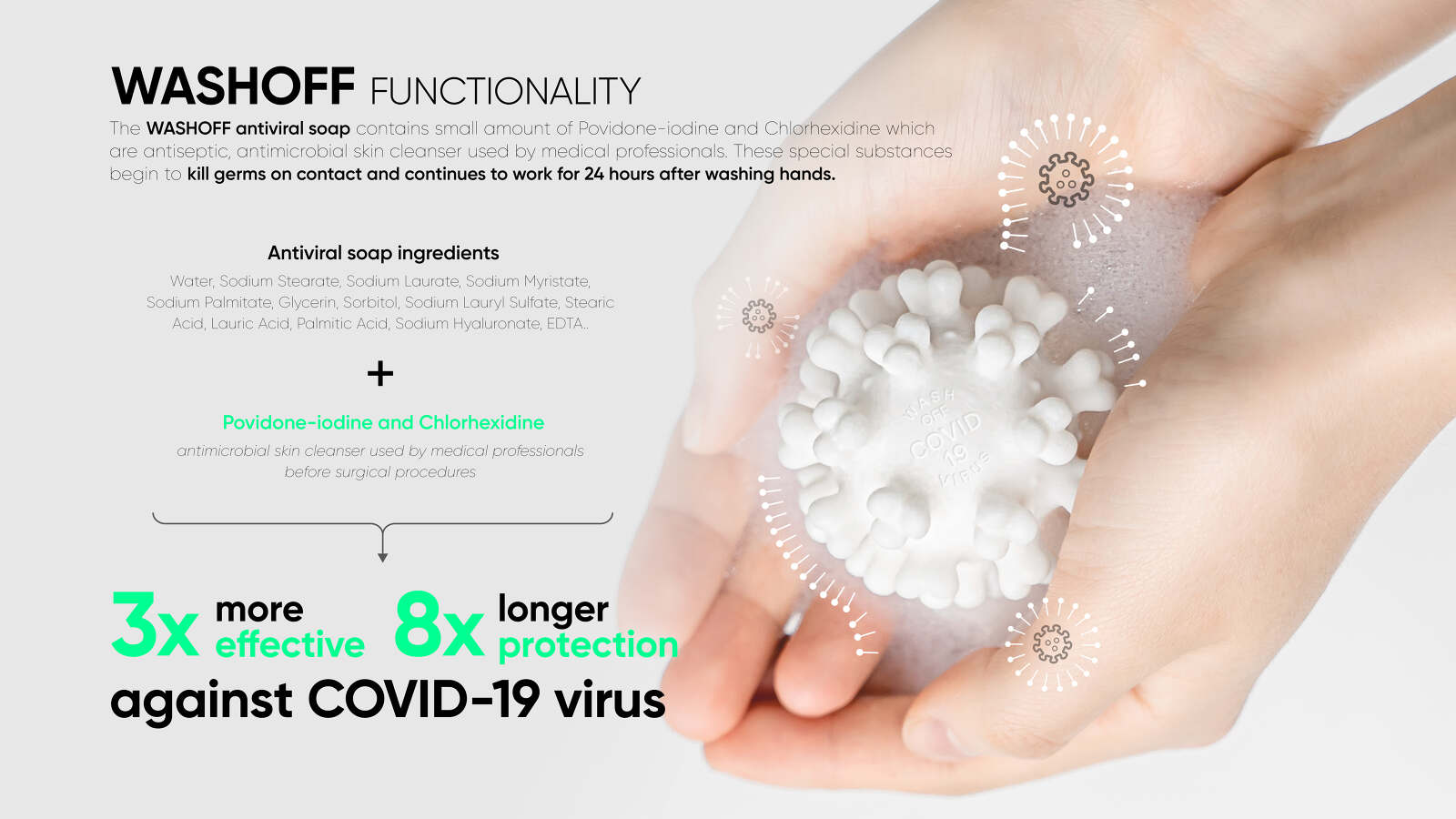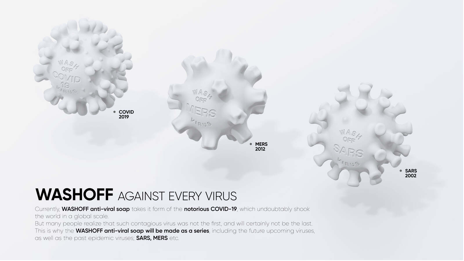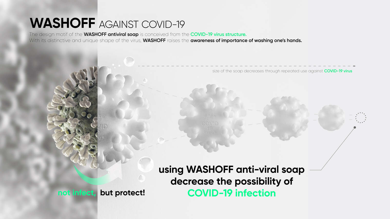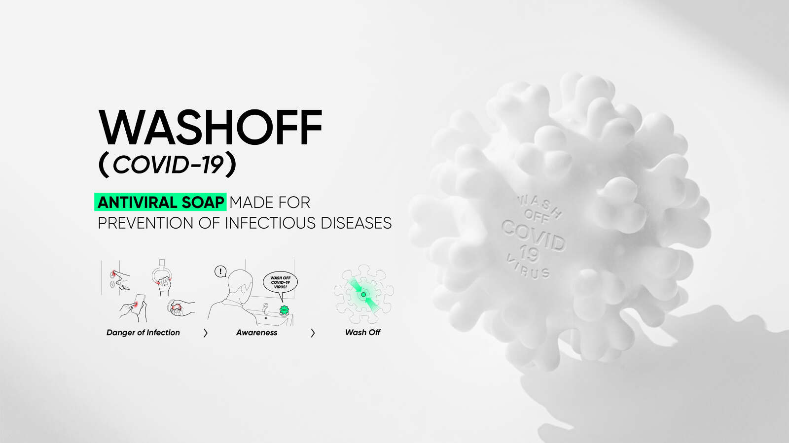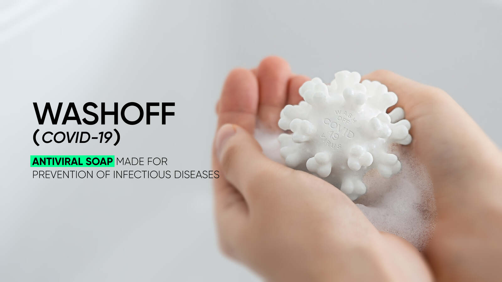 WASHOFF (COVID-19) ANTI-VIRAL SOAP is an antiviral and antiseptic soap that is made for the prevention of infectious diseases. During this pandemic, one of our most effective defenses against invisible germs is to wash your hands frequently with soap and water. The shape of the soap comes from Coronavirus disease 2019 (COVID-19) structure. As users wash their hands, the soap gets smaller and formless through repeated uses. This narrative promotes the idea that handwashing removes the infections and ultimately encourages handwashing with soap. WASHOFF ( Covid-19 ) ANTI-VIRAL SOAP
