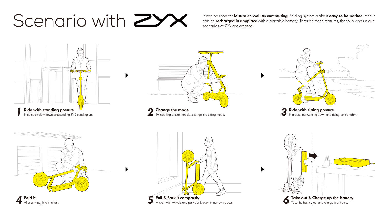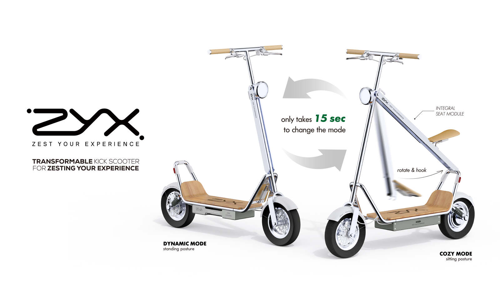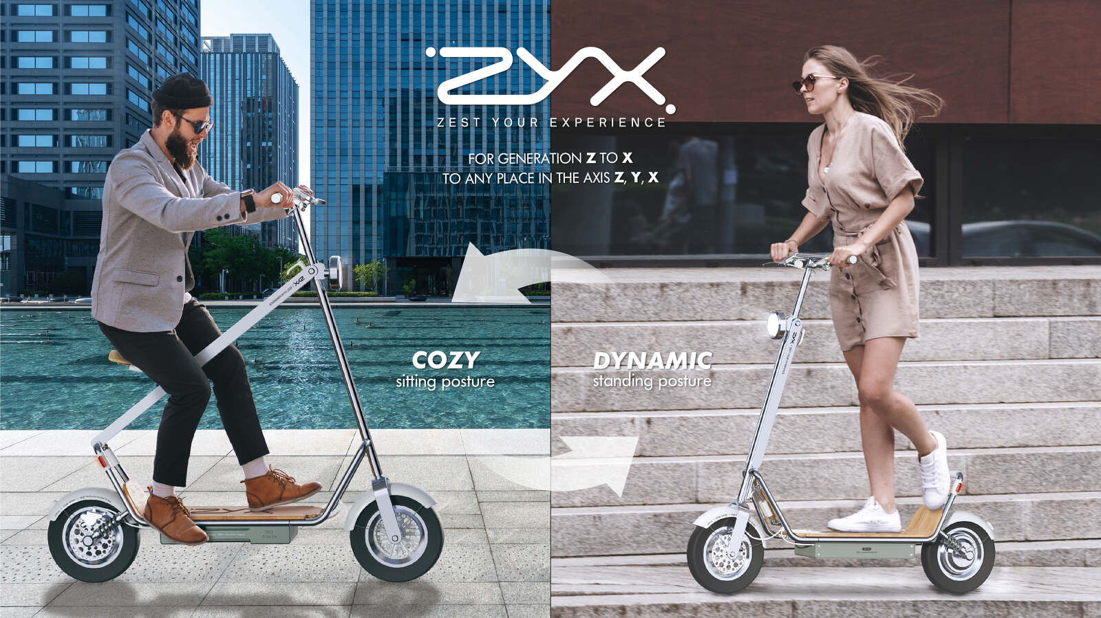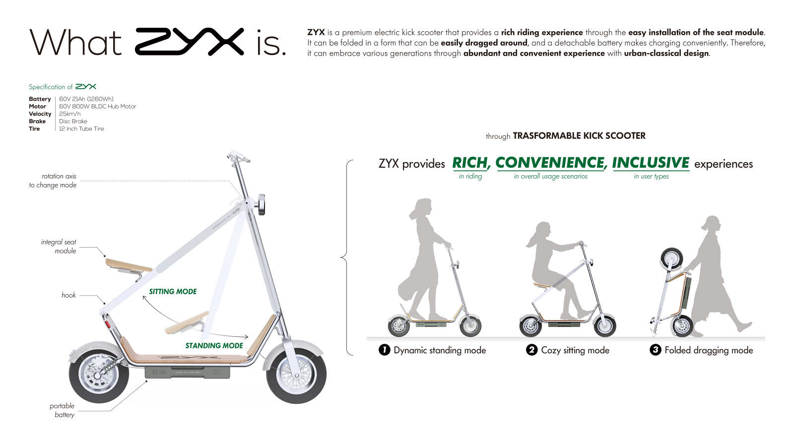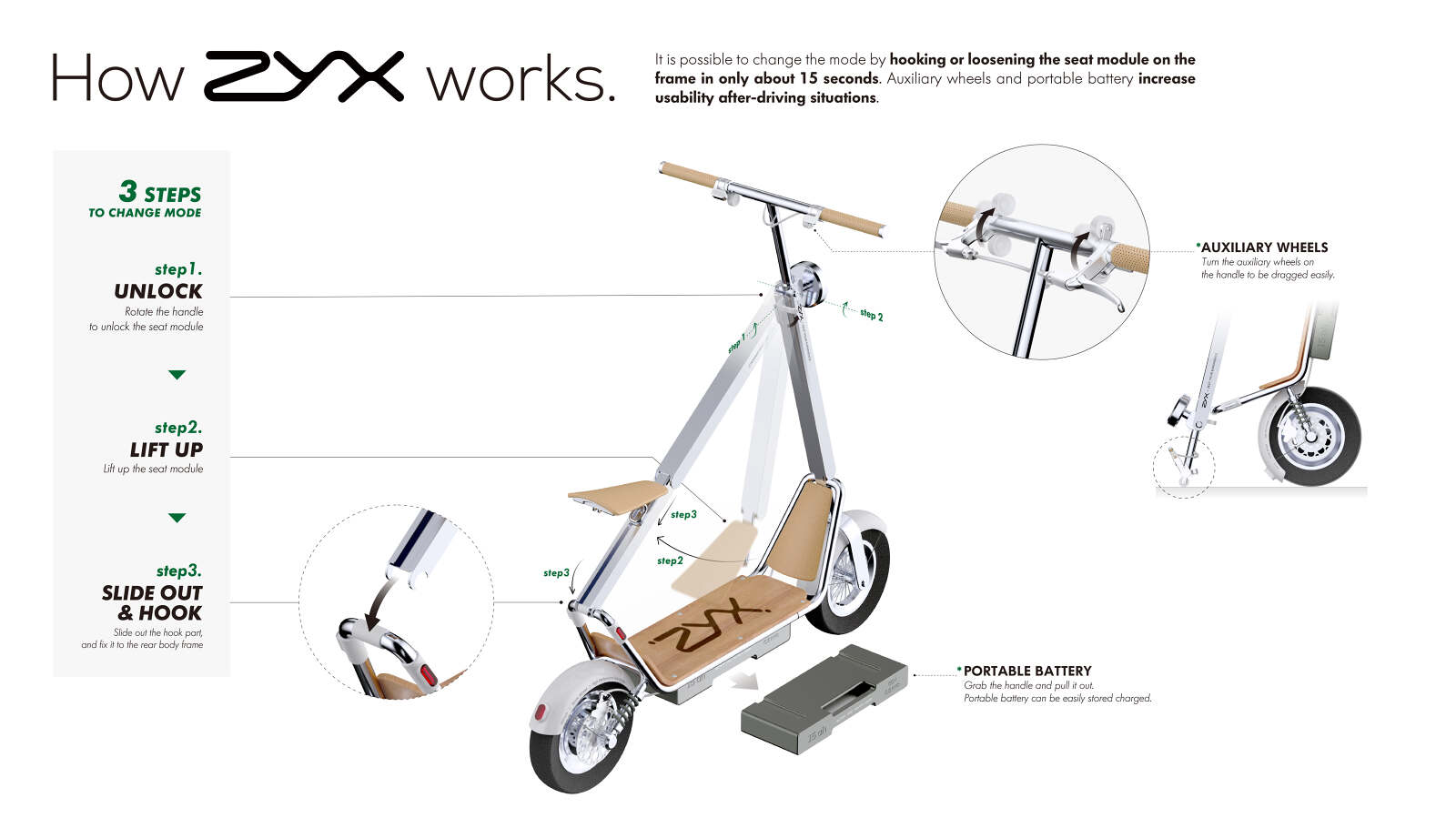 ZYX is a premium transformable electric kick scooter. With the easy installation system of the seat module, it provides a rich riding experience by changing riding postures from standing to sitting or sitting to standing. After riding, it can be folded in half. The auxiliary wheel attached to the handle is turned so that it touches the floor with the rear wheel so that anyone can easily drag it around. And a detachable battery makes charging convenient. With these unique features, it can embrace various types of kick scooter users through abundant and convenient experiences with urban-classical design.